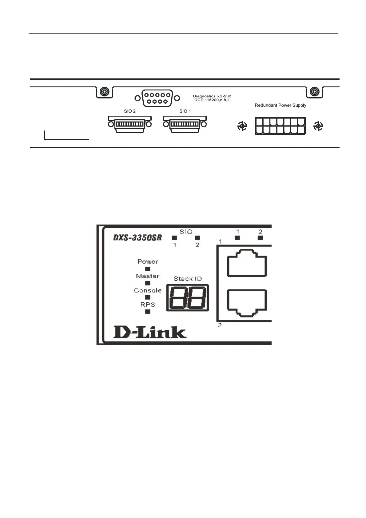 ports is possible. These two stacking ports have corresponding LEDs at the front of the Switch, labeled SIO 1 and SIO 2 and