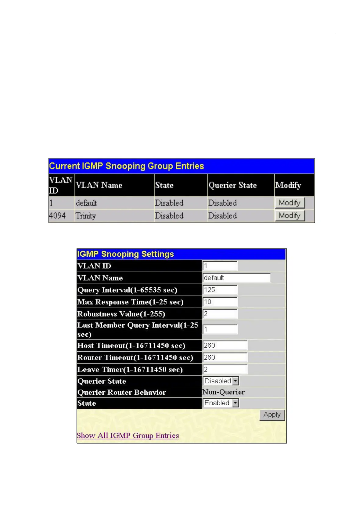 Use the Current IGMP Snooping Group Entries window to view IGMP Snooping settings. To modify the settings, click