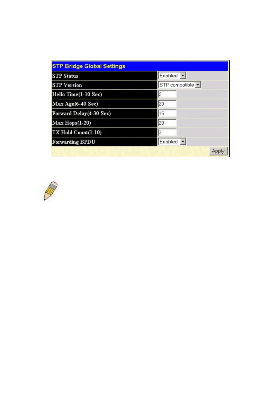 NOTE: The Hello Time cannot be longer than the Max. Age. Otherwise, a configuration