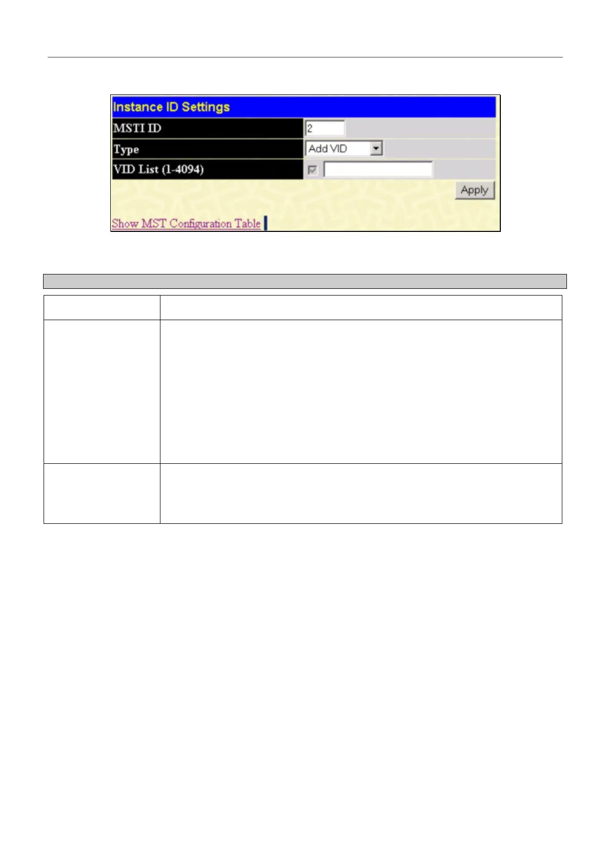 Add - Select this parameter to add VIDs to the MSTI ID, in conjunction with the VID