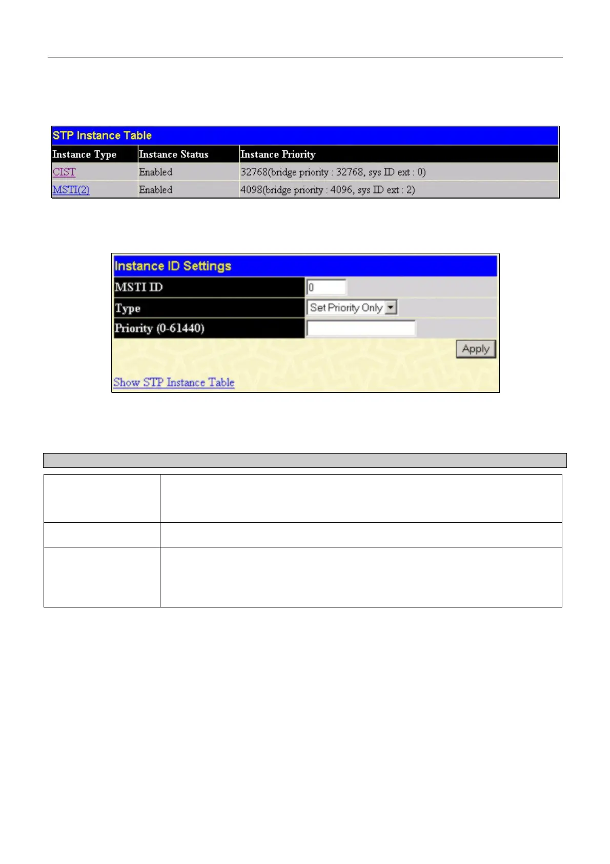 Spanning Tree > STP Instance Settings:
