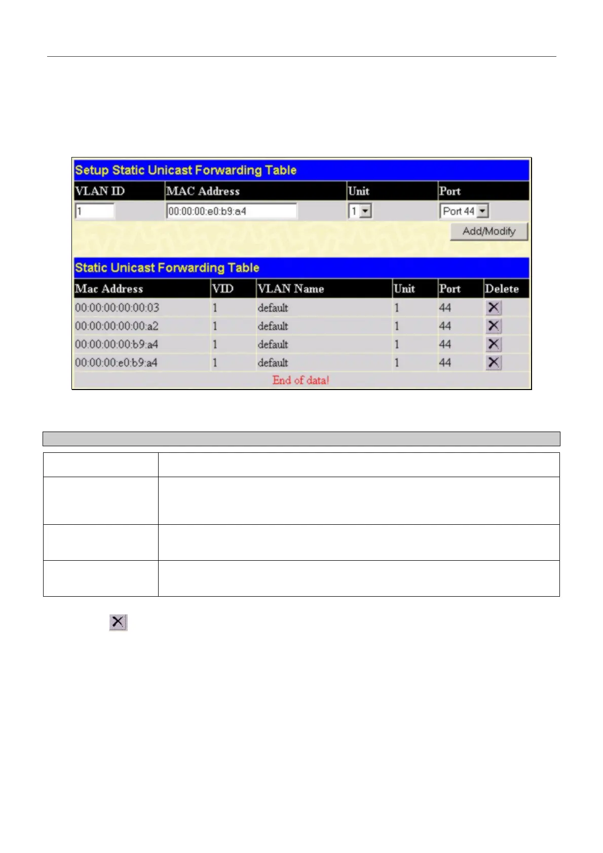 Click Apply to implement the changes made. To delete an entry in the Static Unicast Forwarding Table, click the
