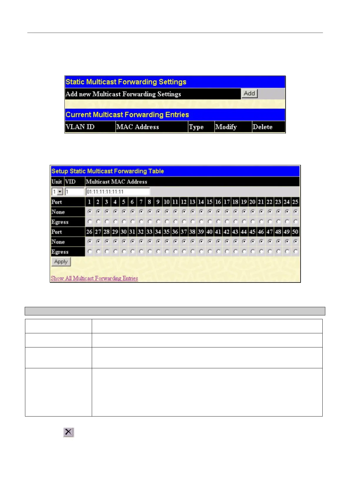 Click Apply to implement the changes made. To delete an entry in the Static Multicast Forwarding Table, click the