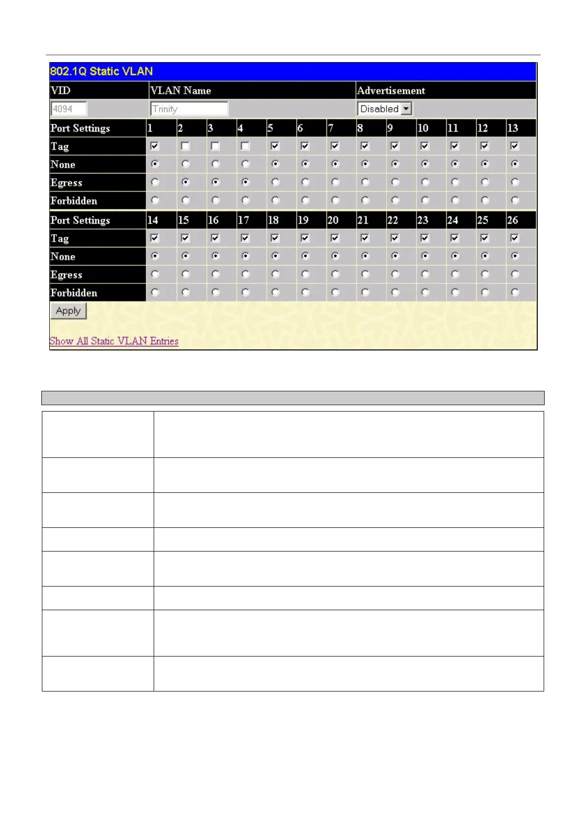 The following fields can then be set in either the Add or Modify 802.1Q Static VLANs menus: