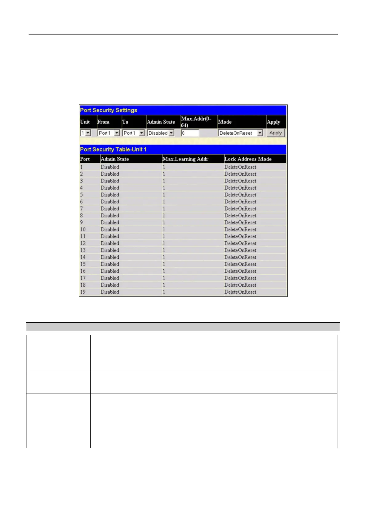 Admin State This pull-down menu allows you to enable or disable Port Security (locked MAC address