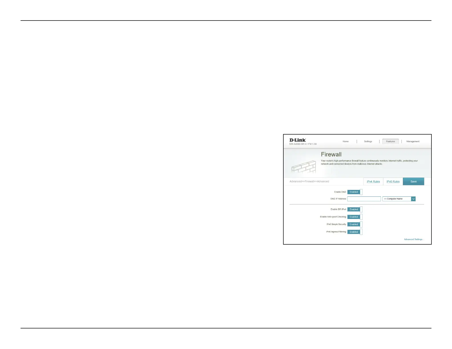 In the Features menu on the bar at the top of the page, click Firewall to congure the router’s rewall settings. The rewall