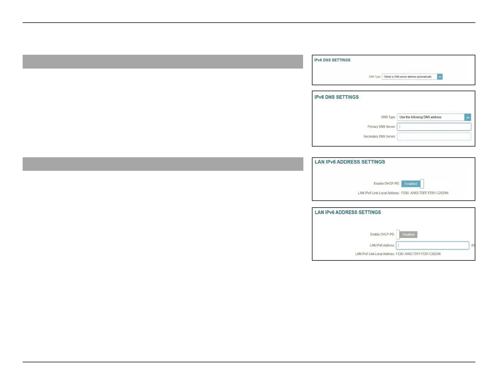 LAN IPv6 Address: Congurable if the above DHCP-PD is disabled. Enter the IP