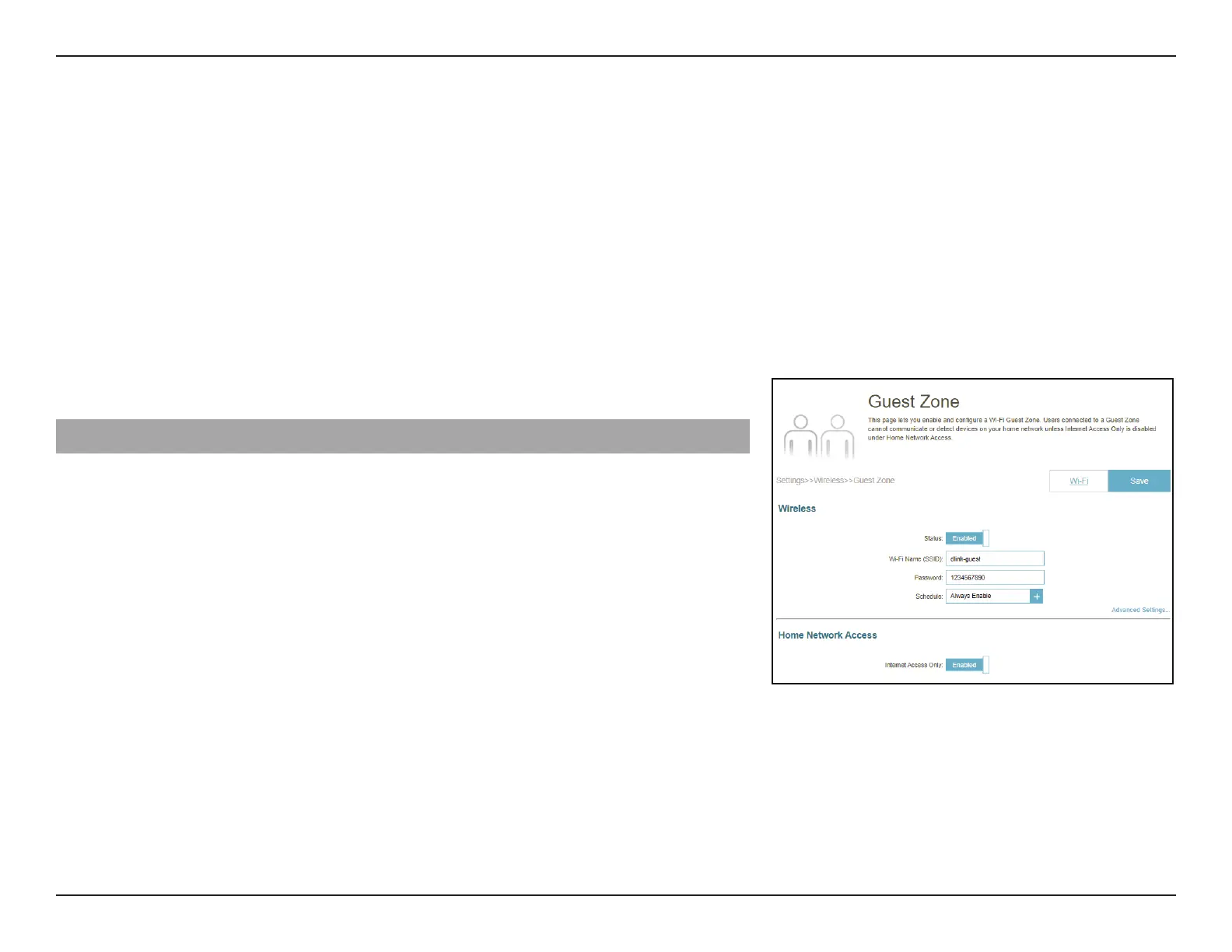 Go to Settings > Wireless, then click on the Guest Zone tab to congure your guest Wi-Fi.
