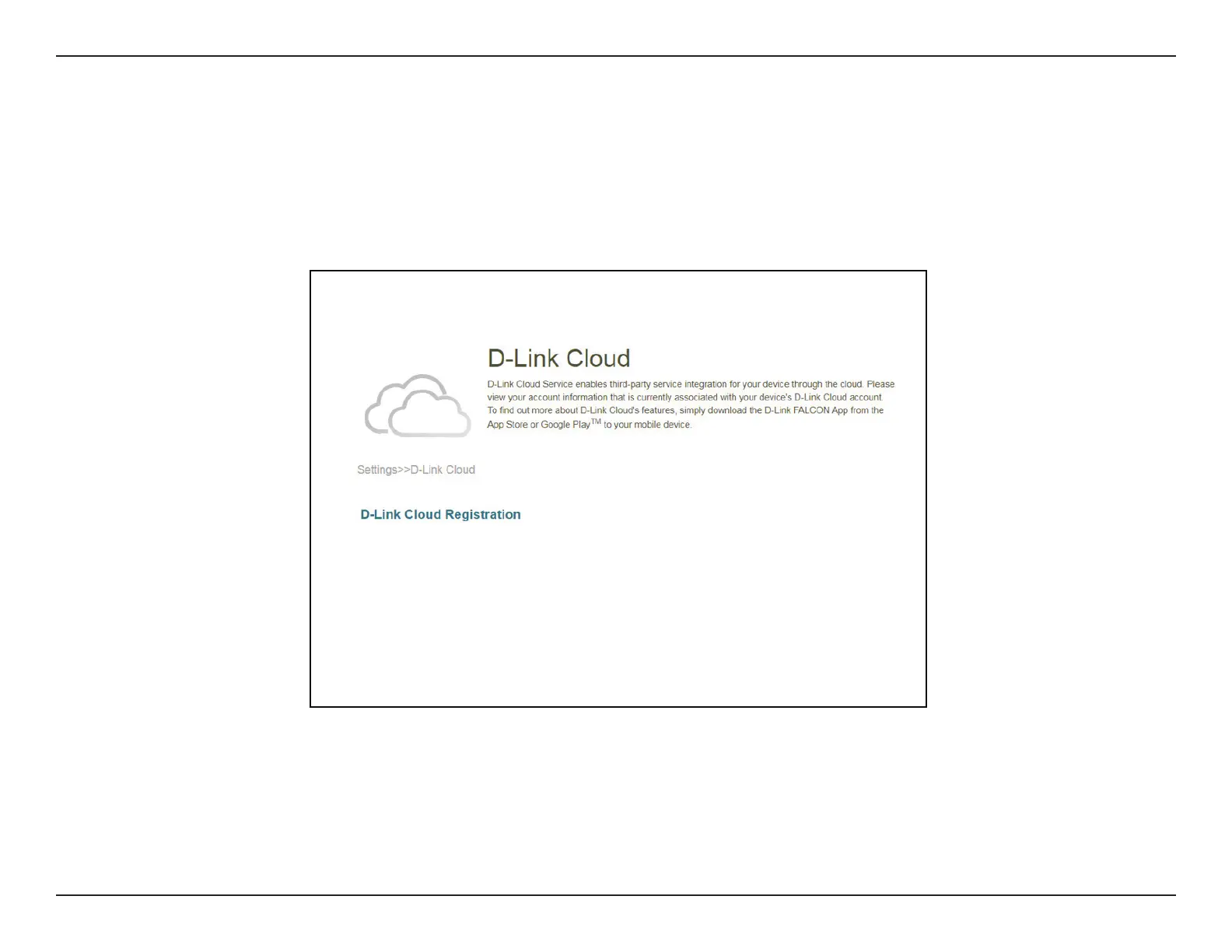 Go to Settings > D-Link Cloud to see your D-Link Cloud Service details. This page shows whether you are registered with
