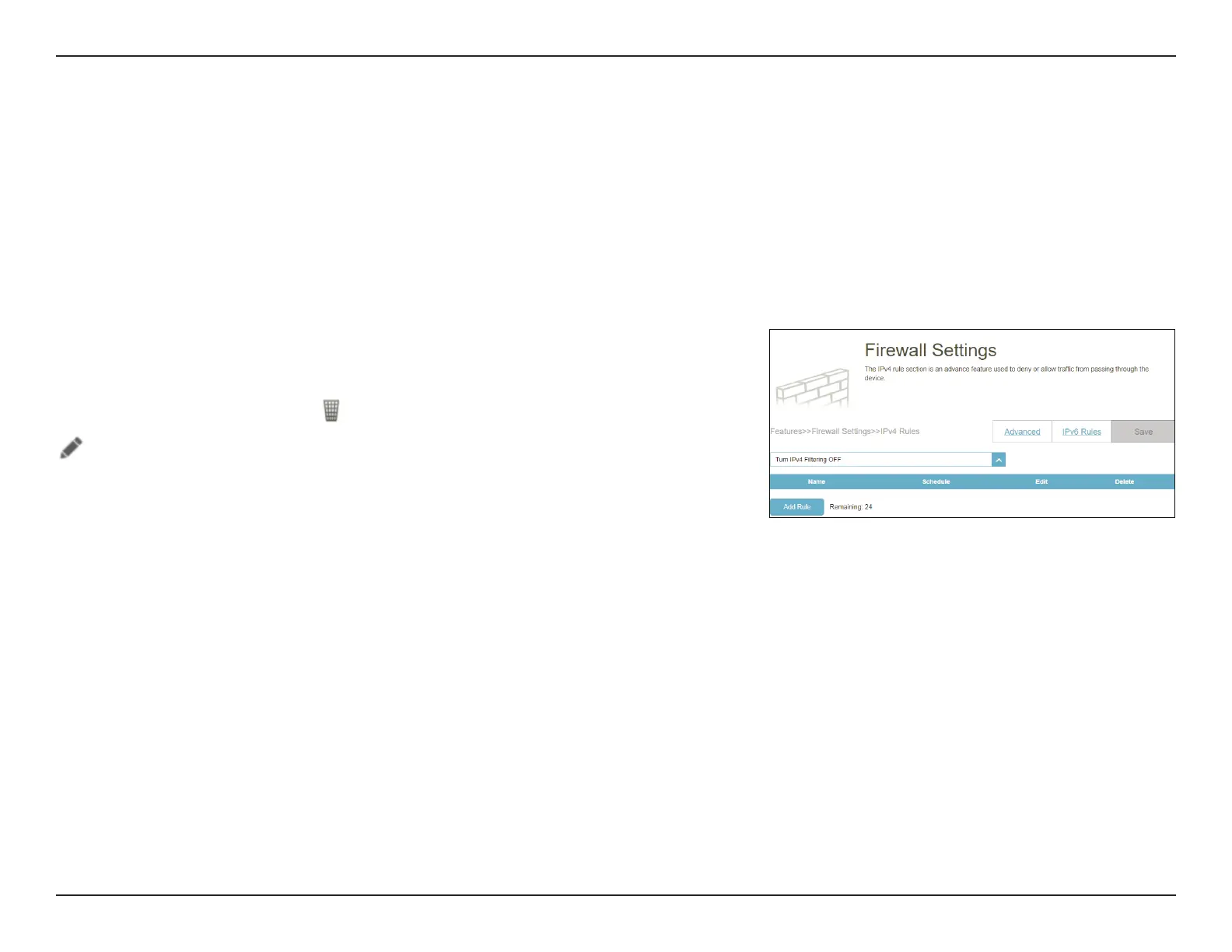 Go to Features > Firewall, then click the IPv4 Rules tab or the IPv6 Rules tab to congure rules for ltering the inbound/