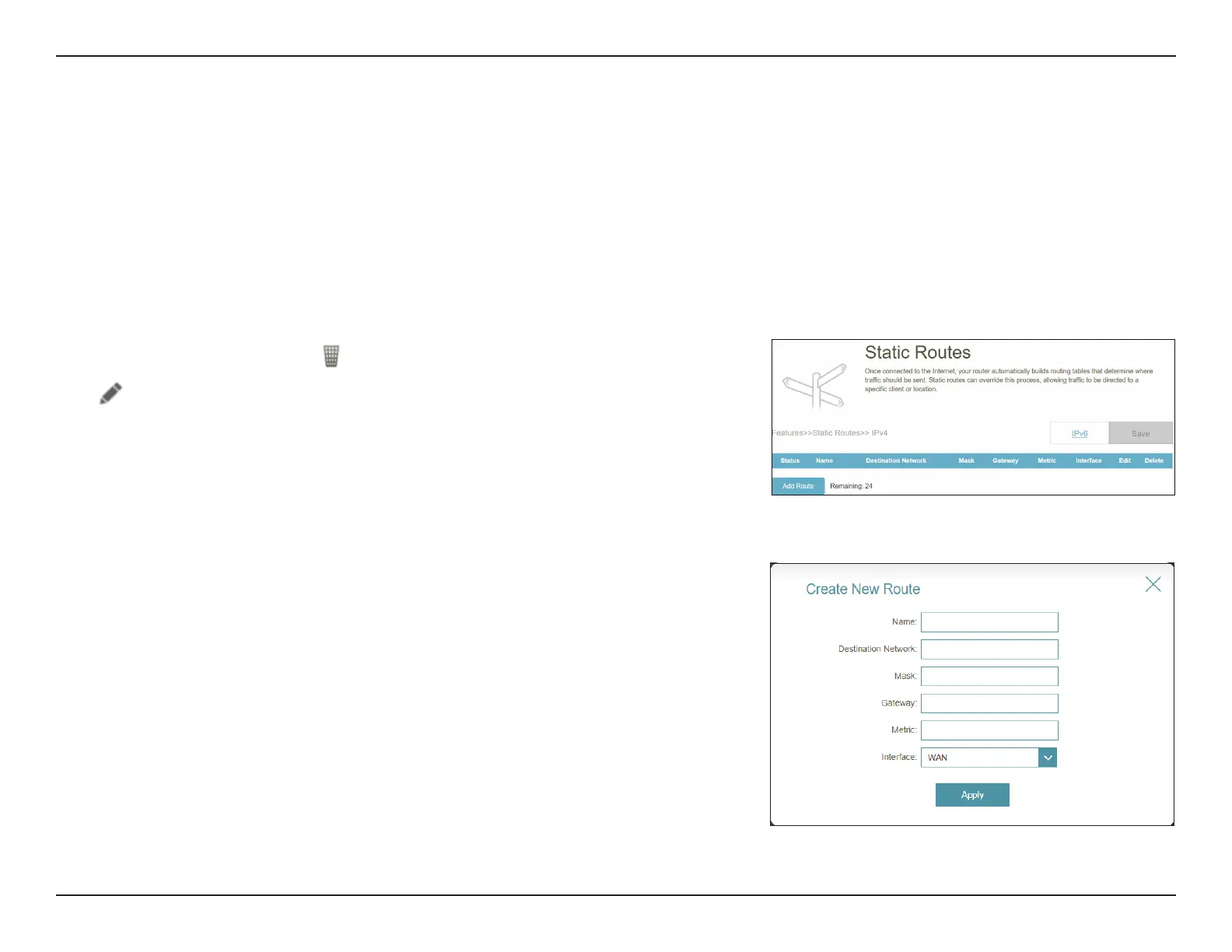 To congure the Static Route IPv6 settings, click the IPv6 tab. Refer to Static Routes - IPv6 on page 77
