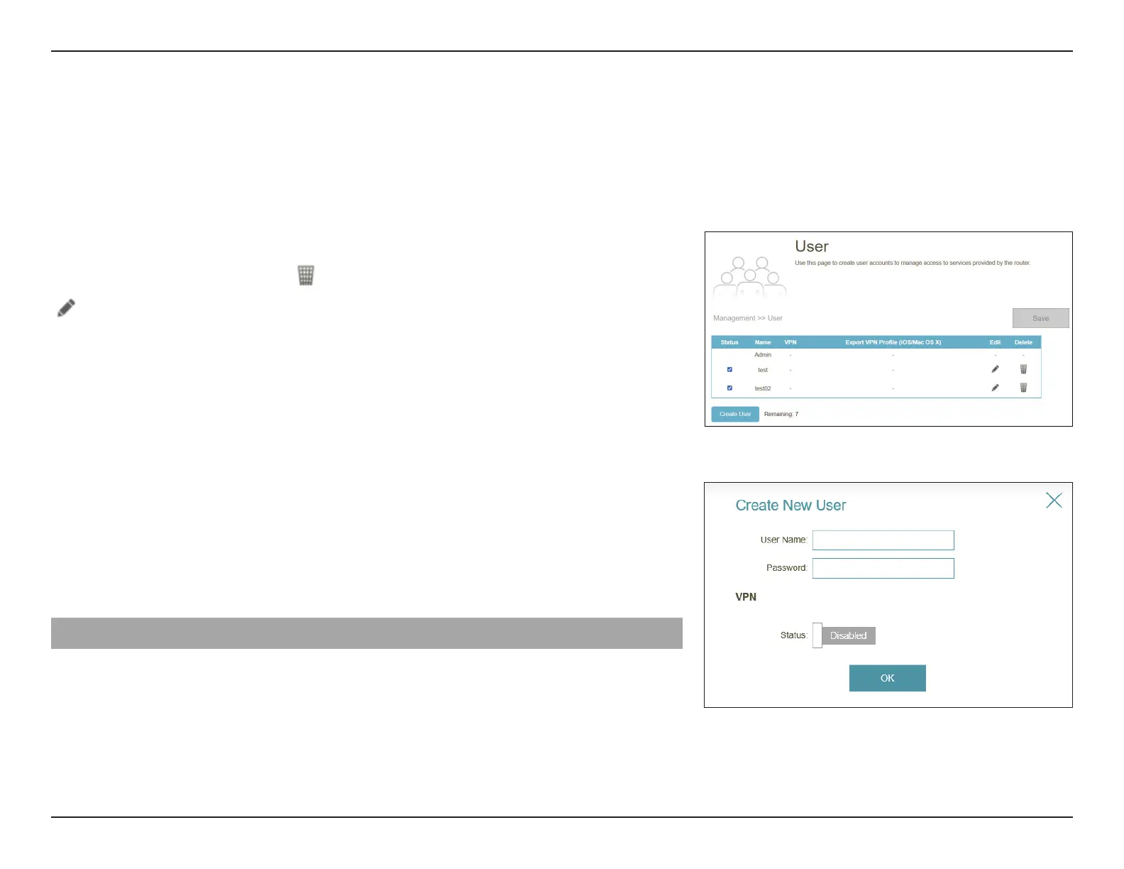 Go to Management > User. The User page is used to create, manage, and delete user accounts with VPN connection