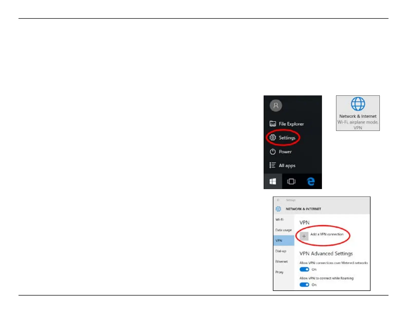 Click Start > Settings > Network & Internet > VPN > Add a VPN Connec-