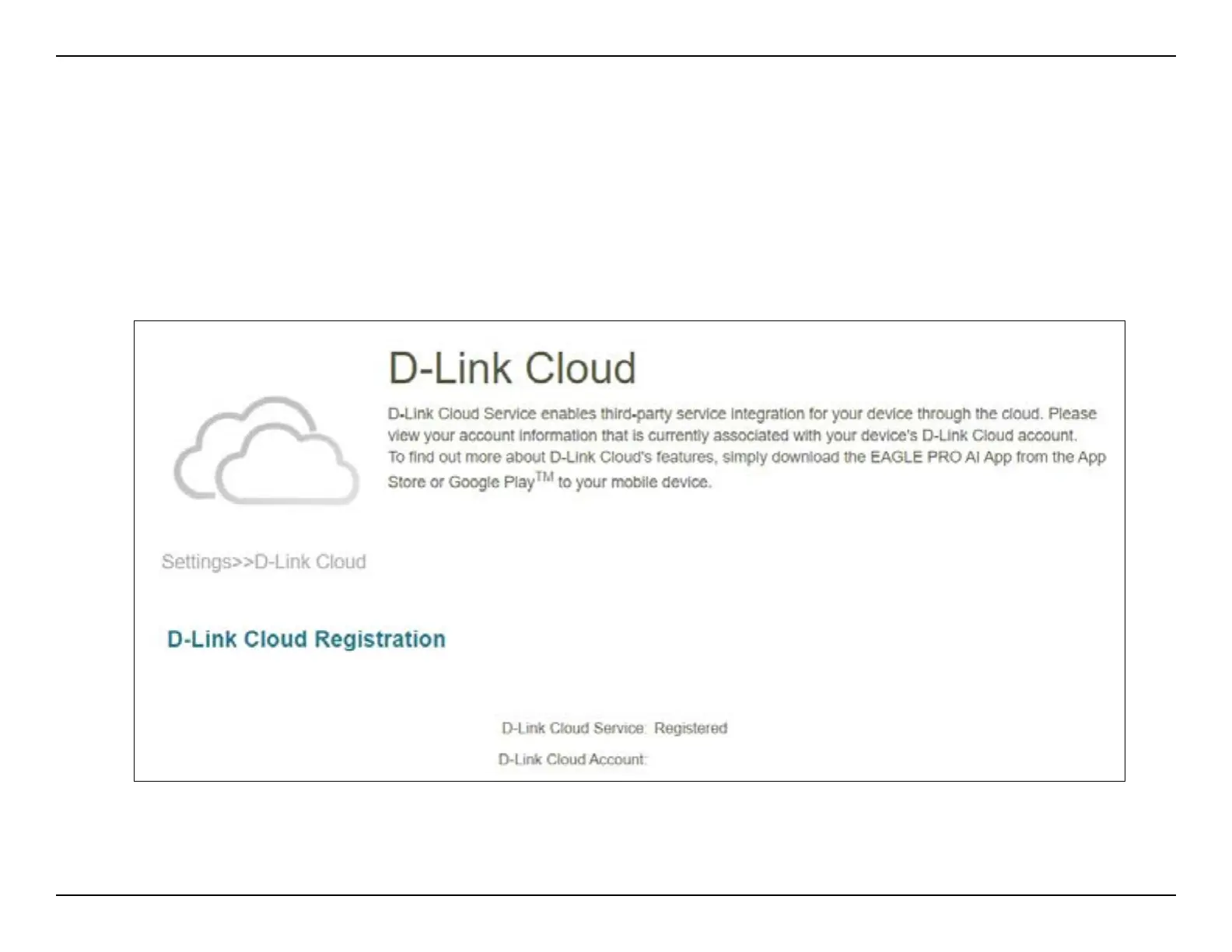Go to Settings > D-Link Cloud to see your D-Link Cloud Service details. This page lists whether you are registered with