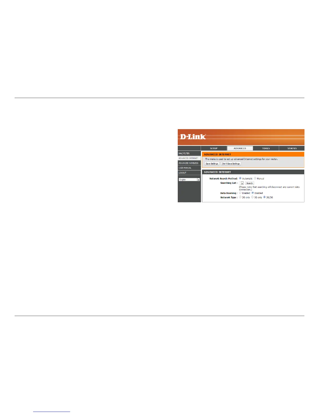 Use this section to set the search methods, data roaming preferences and type of mobile Internet network connection the router will use.