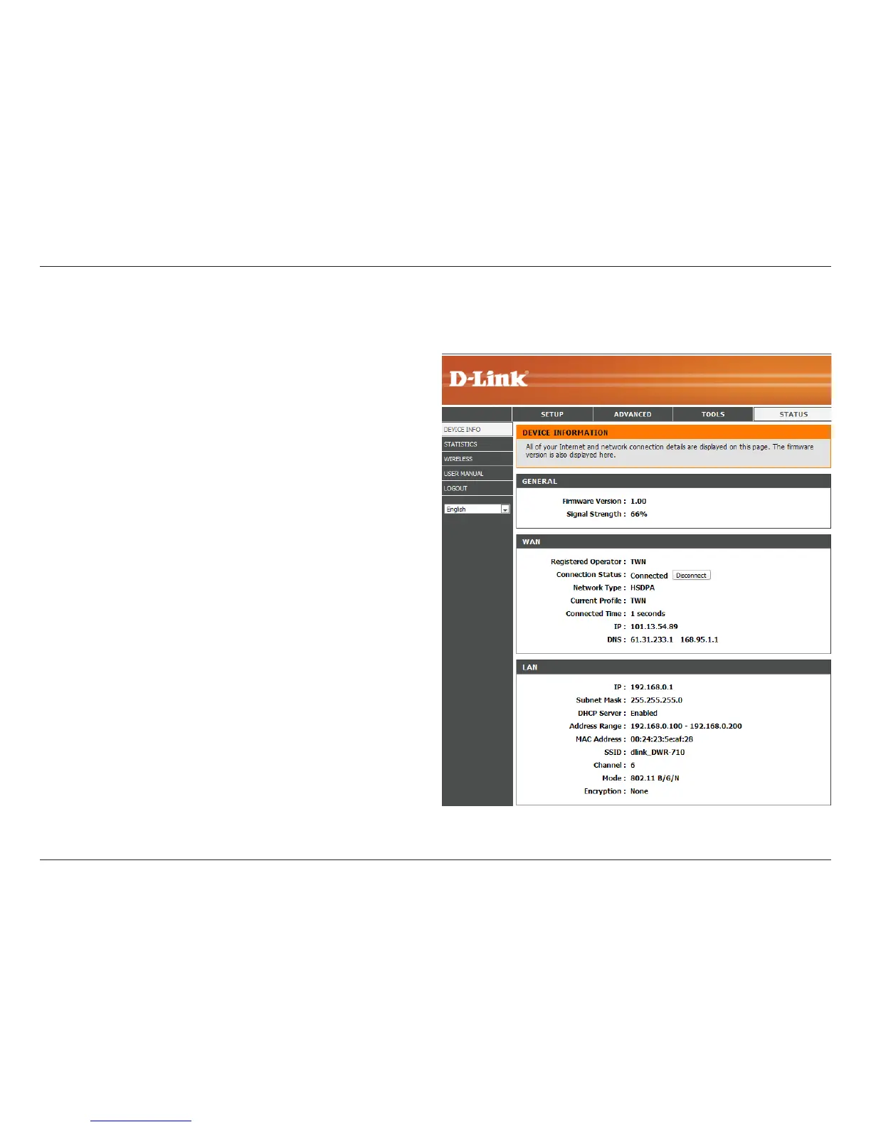 All of your Internet and network connection details are displayed on this page. The rmware version is also displayed here.