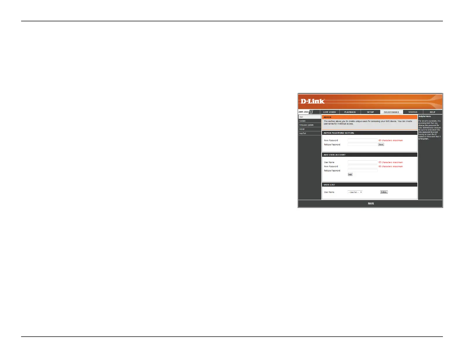 The Administrator can congure all functions of the NVR, as well as set user access to the NVR. The Administrator account cannot be deleted. The