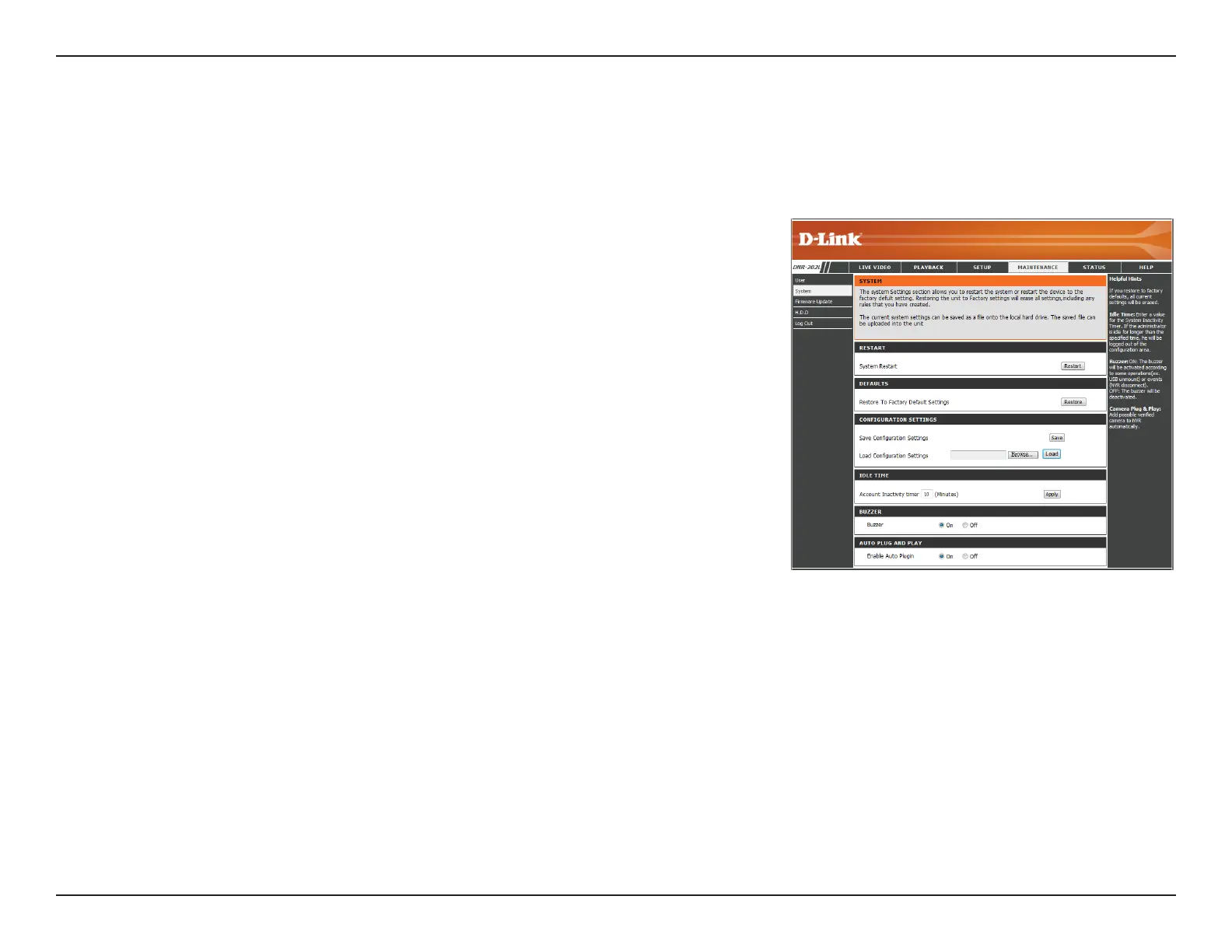The System settings section allows you to restart the system or reset the device to its factory default settings. Restoring the