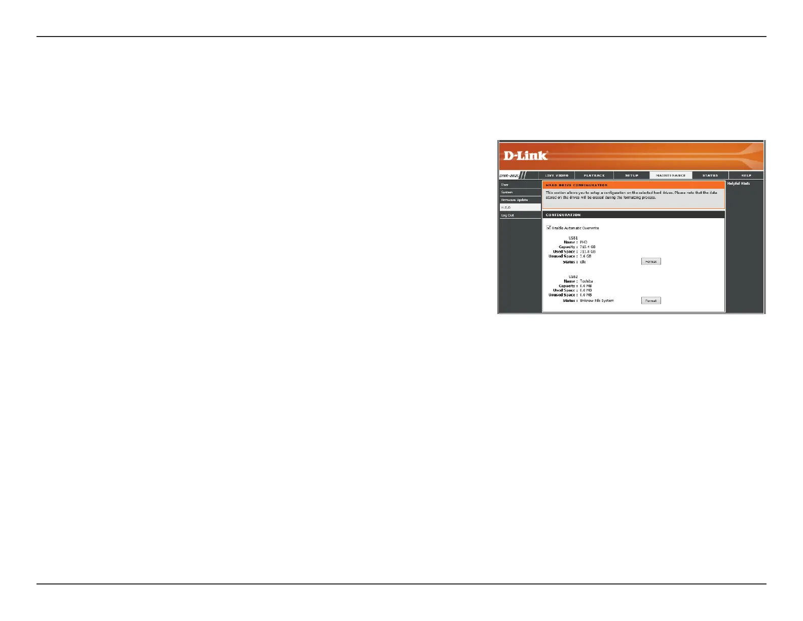 This page displays information about the USB external storage for the DNR-202L. It also allows the user to congure the