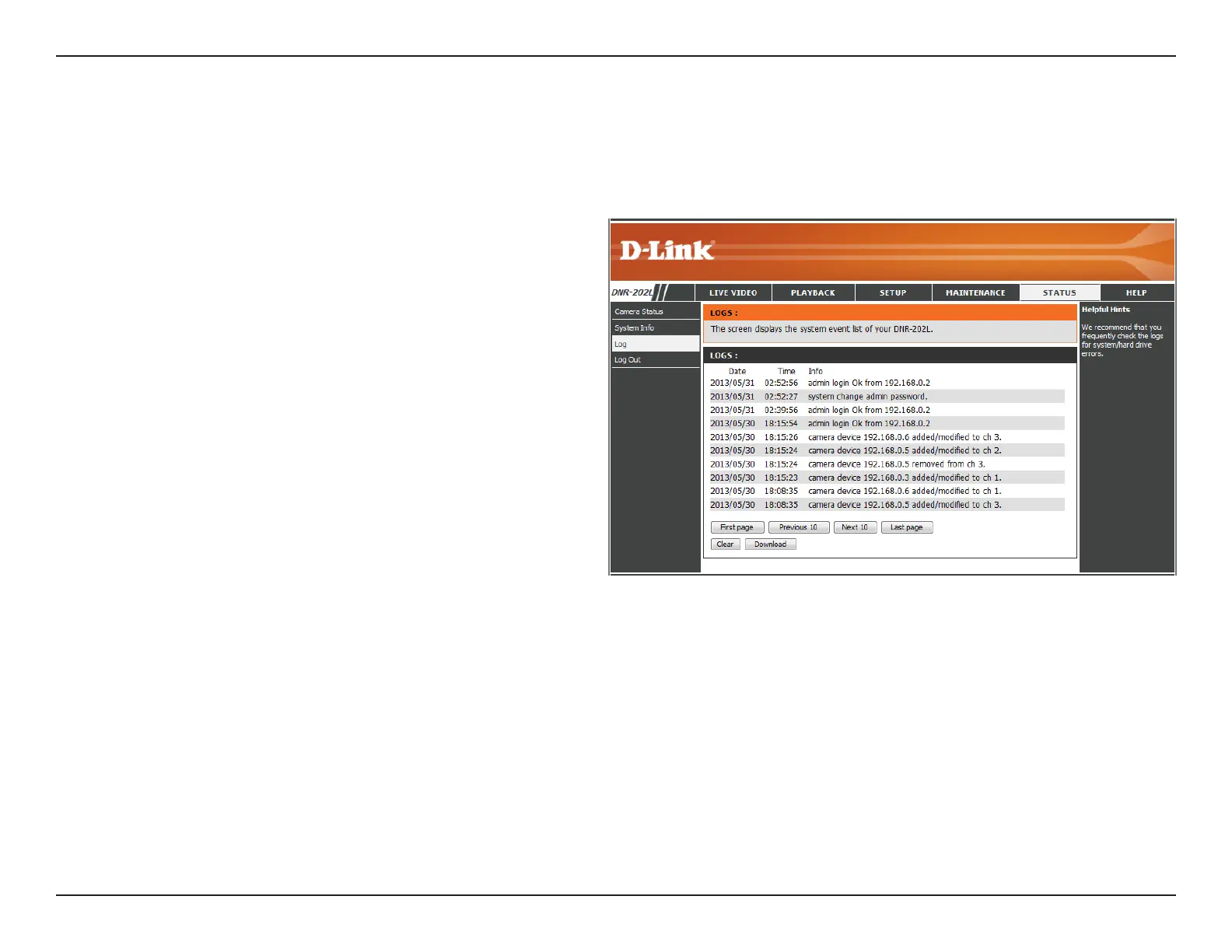 This page displays the system event list of your DNR-202L.