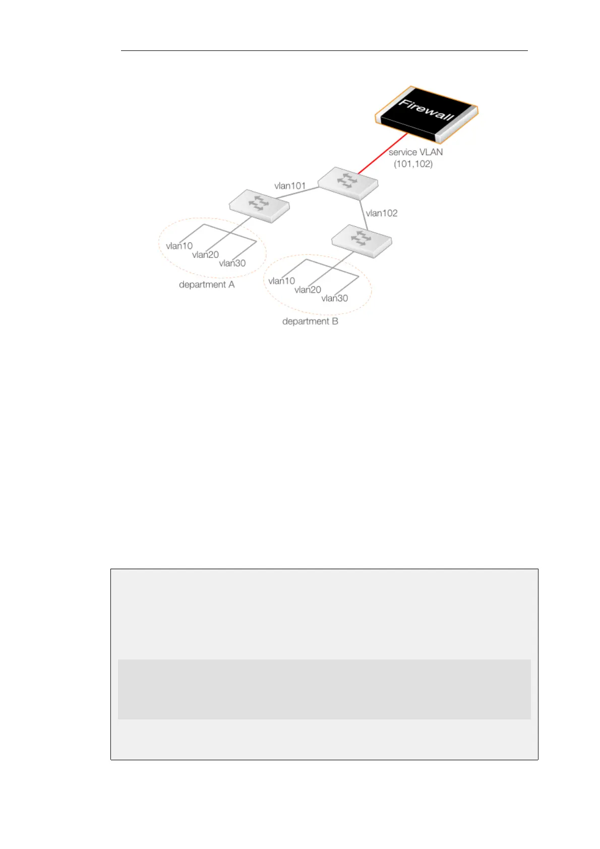 Here, corporate departments A and B each use two VLANs where the VLAN IDs 10 and 20 can be
