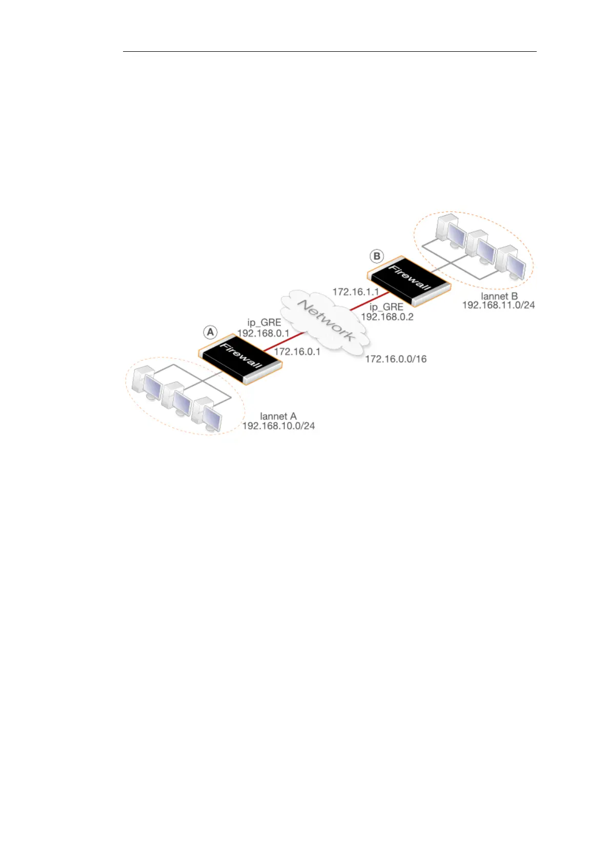 The diagram below shows a typical GRE scenario, where two NetDefend Firewalls labeled A and