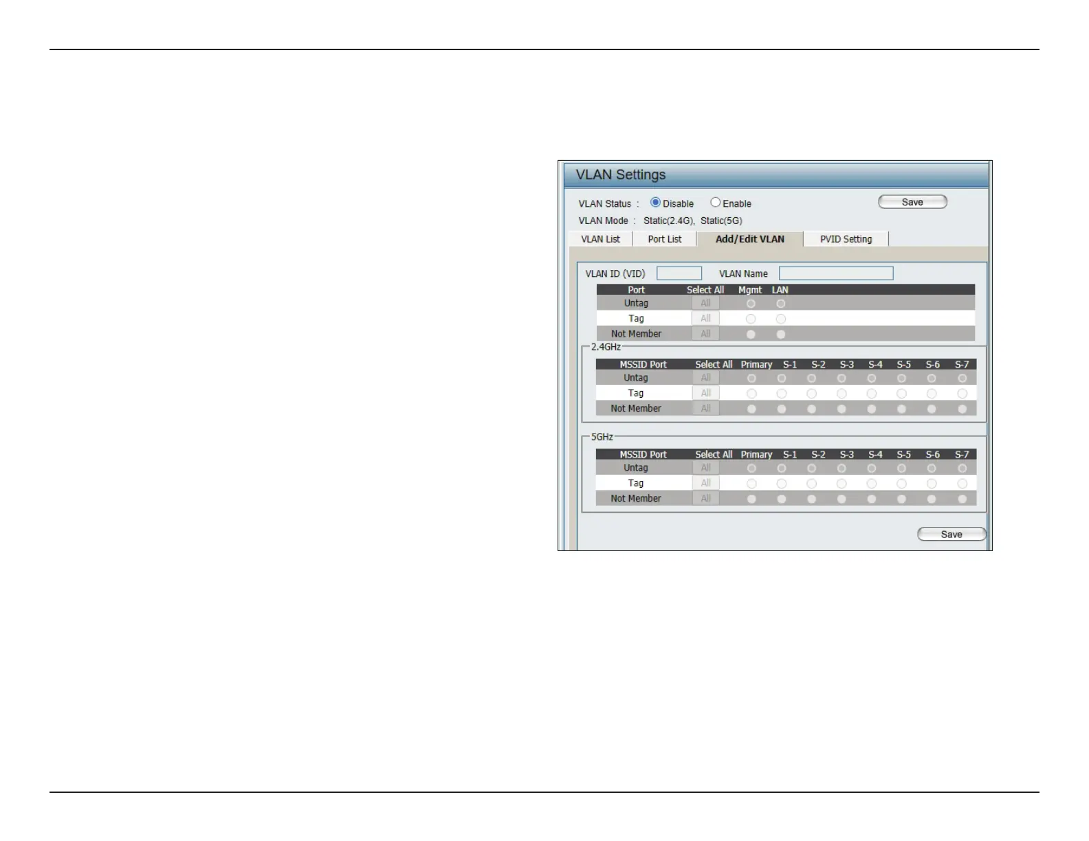 The Add/Edit VLAN tab is used to congure VLANs. Once you have made the desired changes, click the Save button to let your changes take