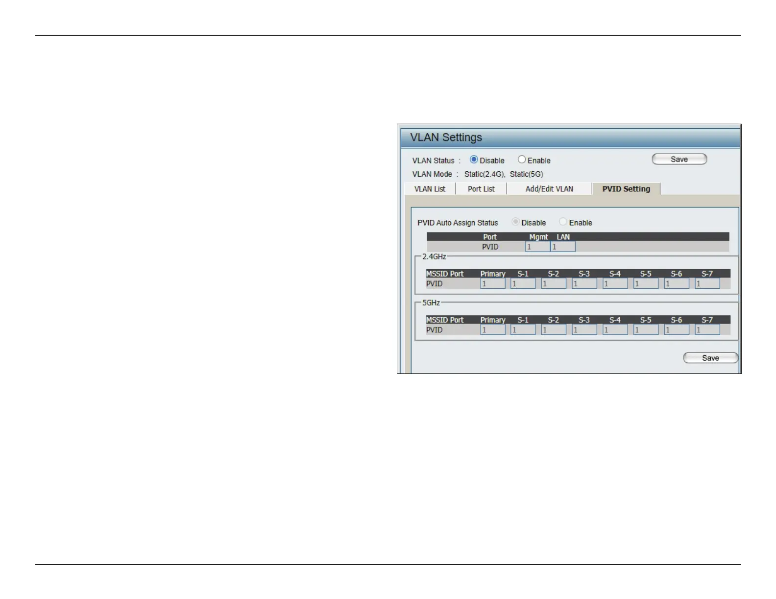 The PVID Settings tab is used to enable/disable the Port VLAN Identier Auto Assign Status as well as to congure various types of PVID settings.
