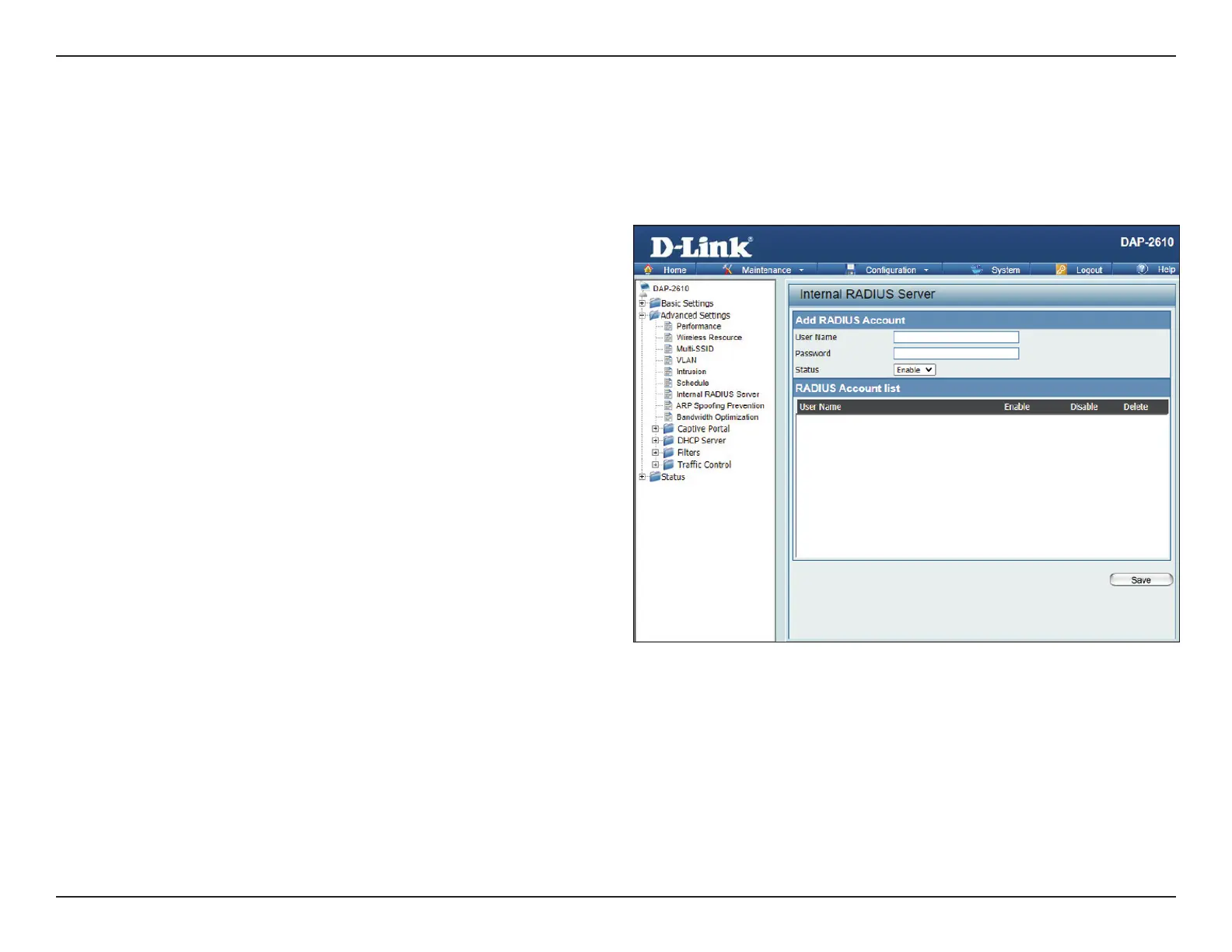 The DAP-2610 features a built-in RADIUS server. Once you have nished adding a RADIUS account, click the Save button to let your changes take