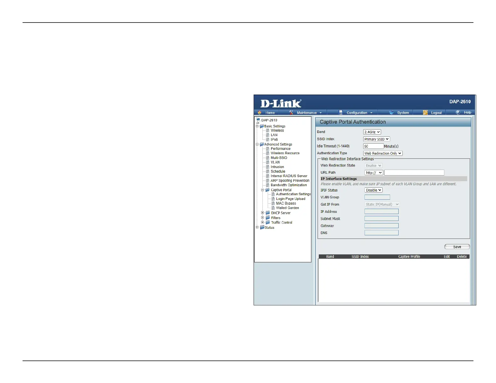 page. In this window, user can view and congure the Captive Portal settings. After selecting Web Redirection Only as the Authentication Type,