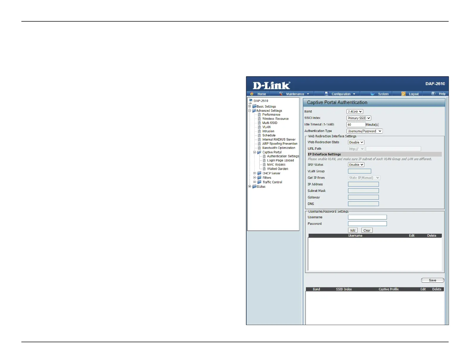 page. In this window, you can view and congure the Captive Portal settings. After selecting Username/Password as the authentication type, you