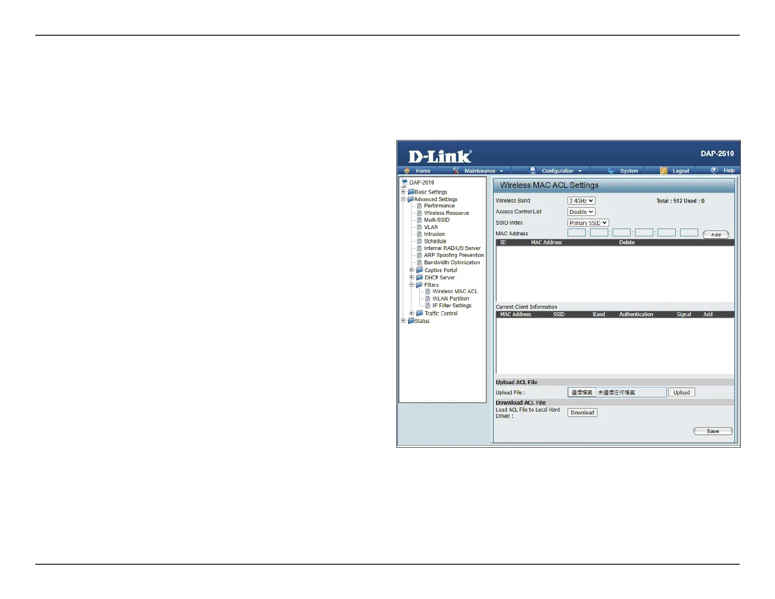 This page allows the user to congure Wireless MAC ACL settings for access control.