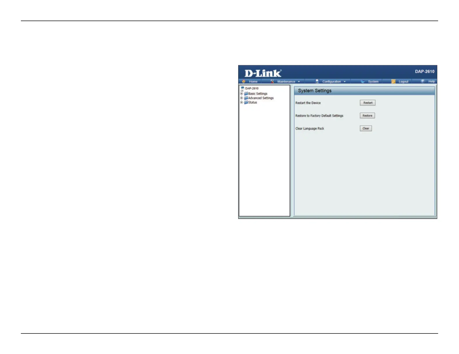 On this page the user can restart the unit, perform a factory reset of the access point or clear the added language pack.