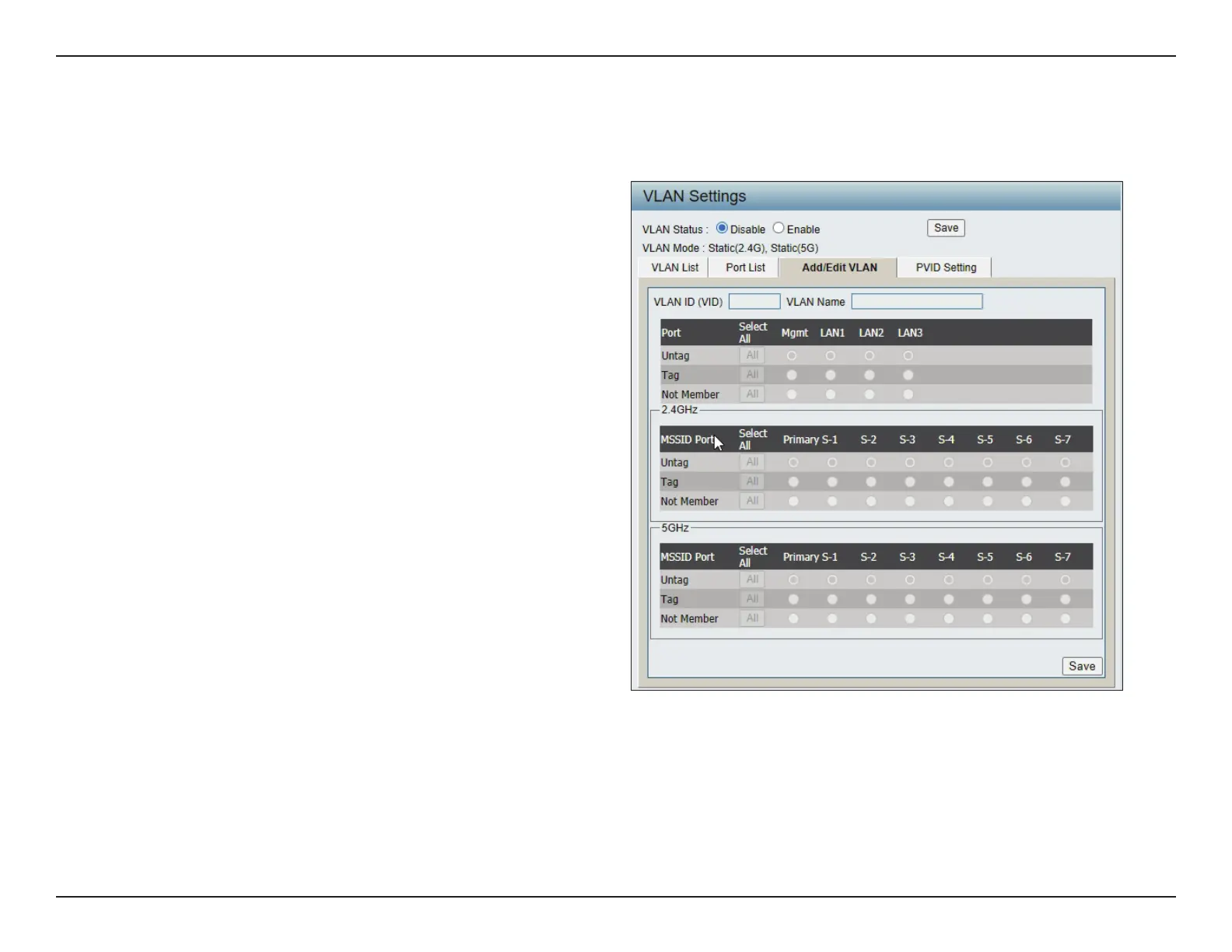 The Add/Edit VLAN tab is used to congure VLANs. Once you have made the desired changes, click the Save button to let your changes take
