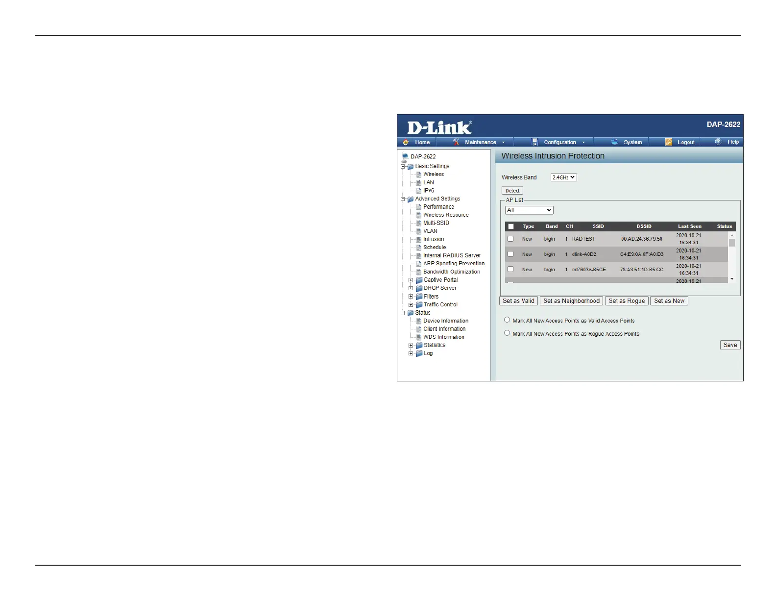 The Wireless Intrusion Protection window is used to set your APs to All, Valid, Neighborhood, Rogue, and New. Click the Save button to let
