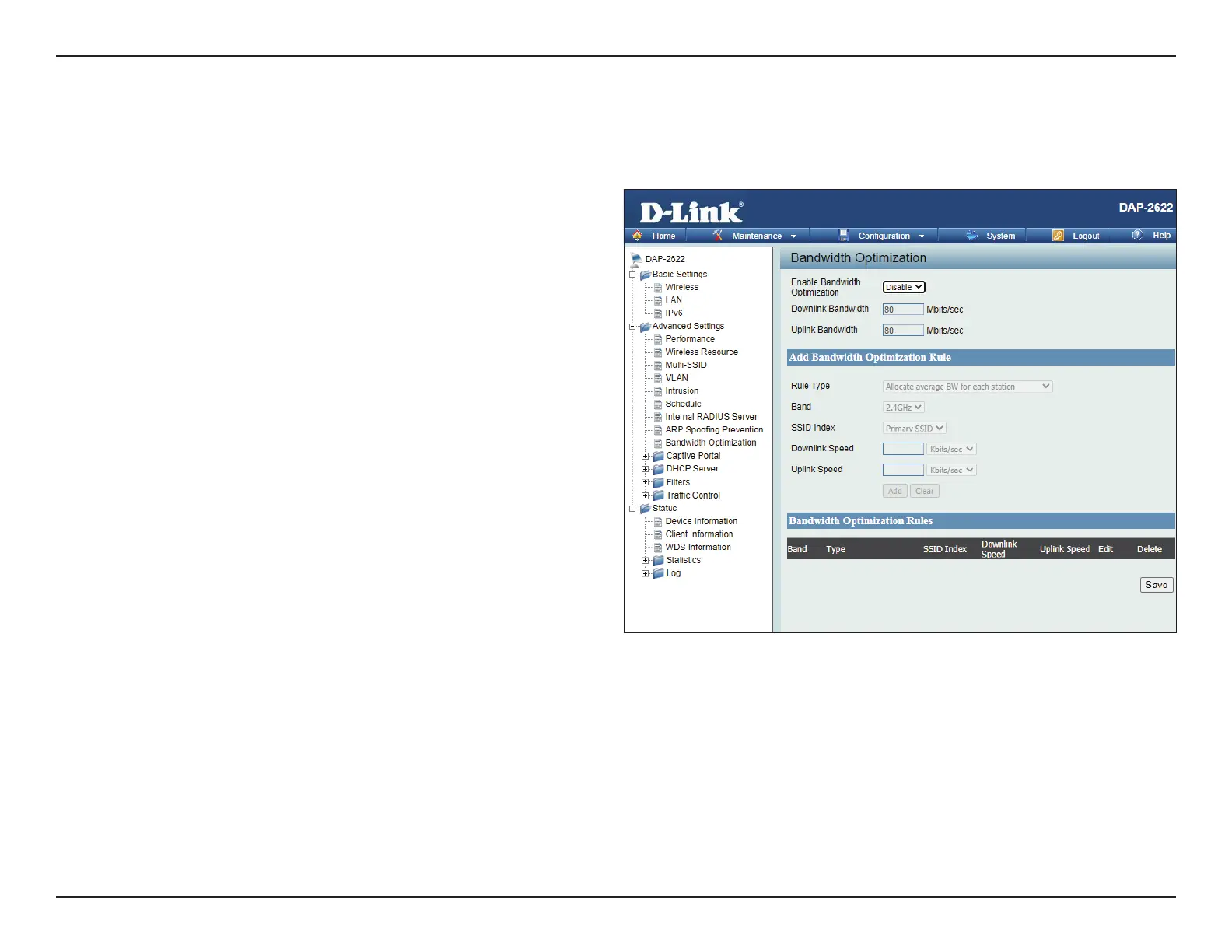 The Bandwidth Optimization window allows the user to manage the bandwidth of the device and arrange the bandwidth for various wireless