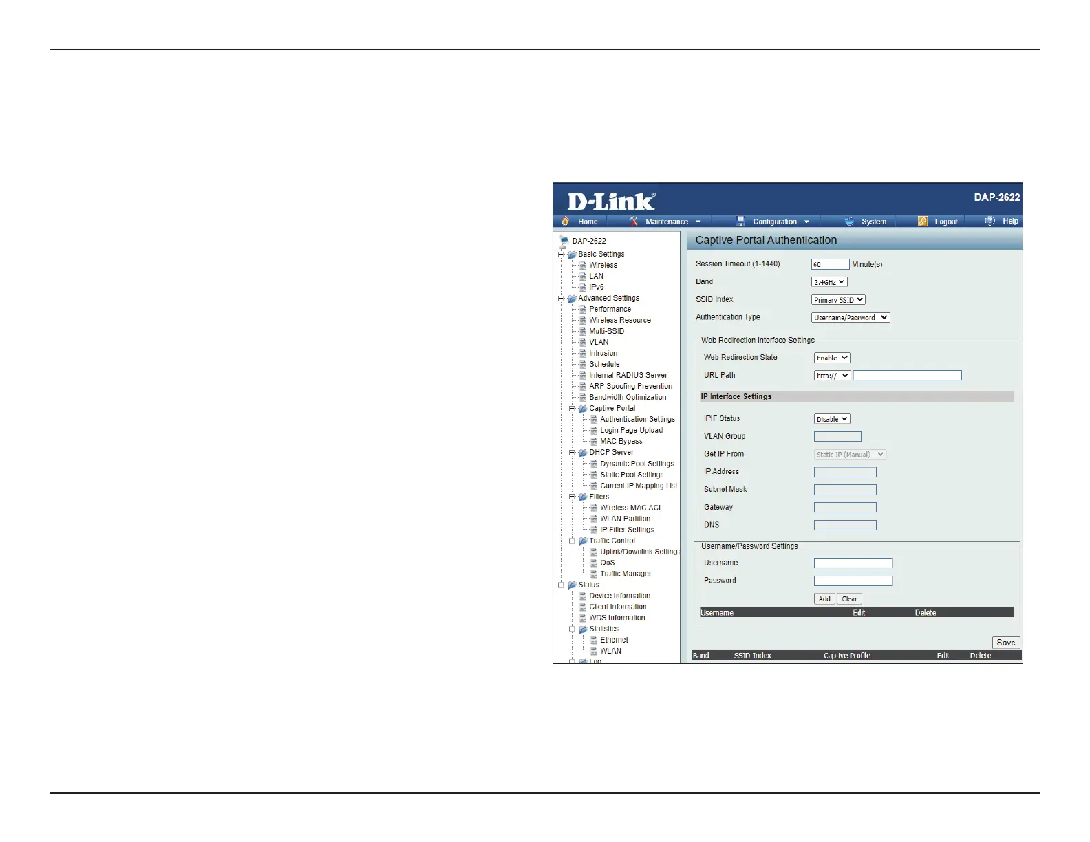 page. In this window, you can view and congure the Captive Portal settings. After selecting Username/Password as the authentication type, you
