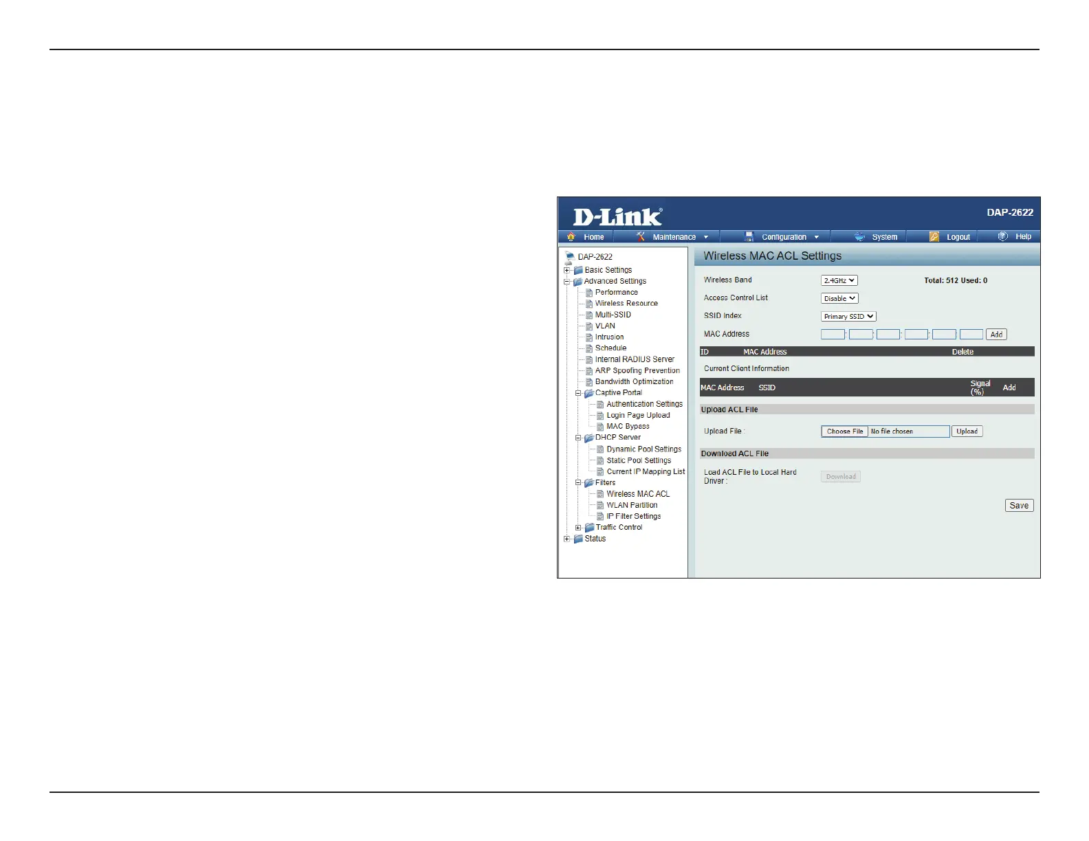 This page allows the user to congure Wireless MAC ACL settings for access control.