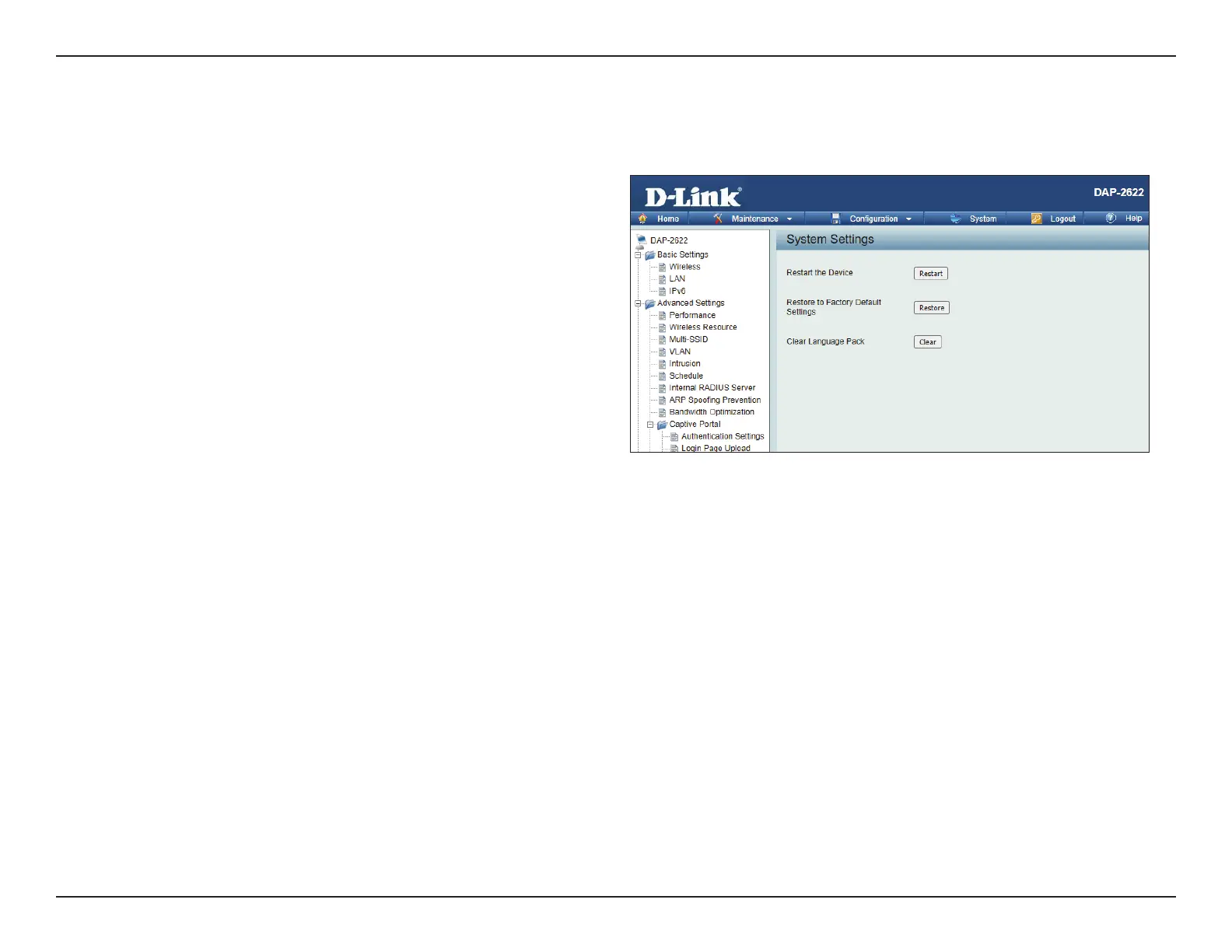 On this page the user can restart the unit, perform a factory reset of the access point or clear the added language pack.