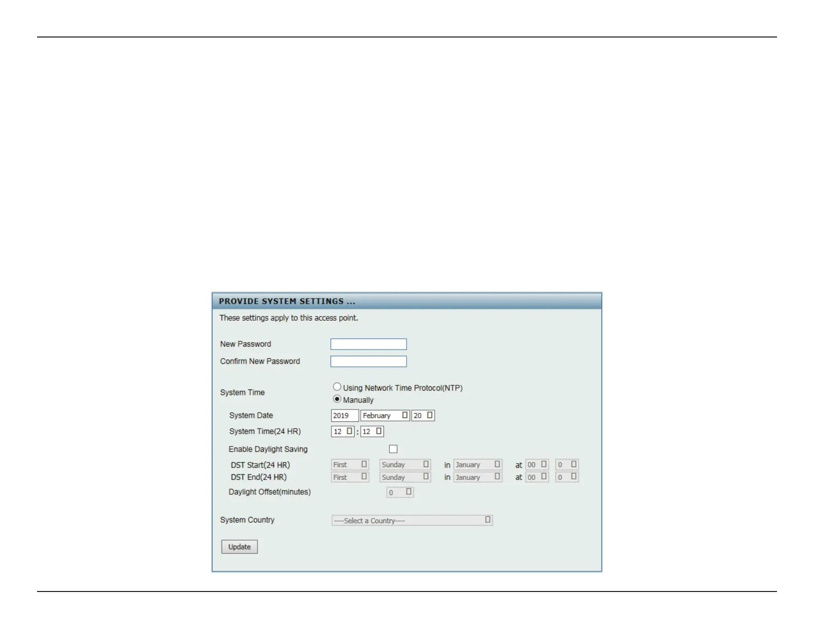 y Setting System Time Manually: From the System Date drop-down menu, select the Year, Month, and Day along with the Hour and Minutes