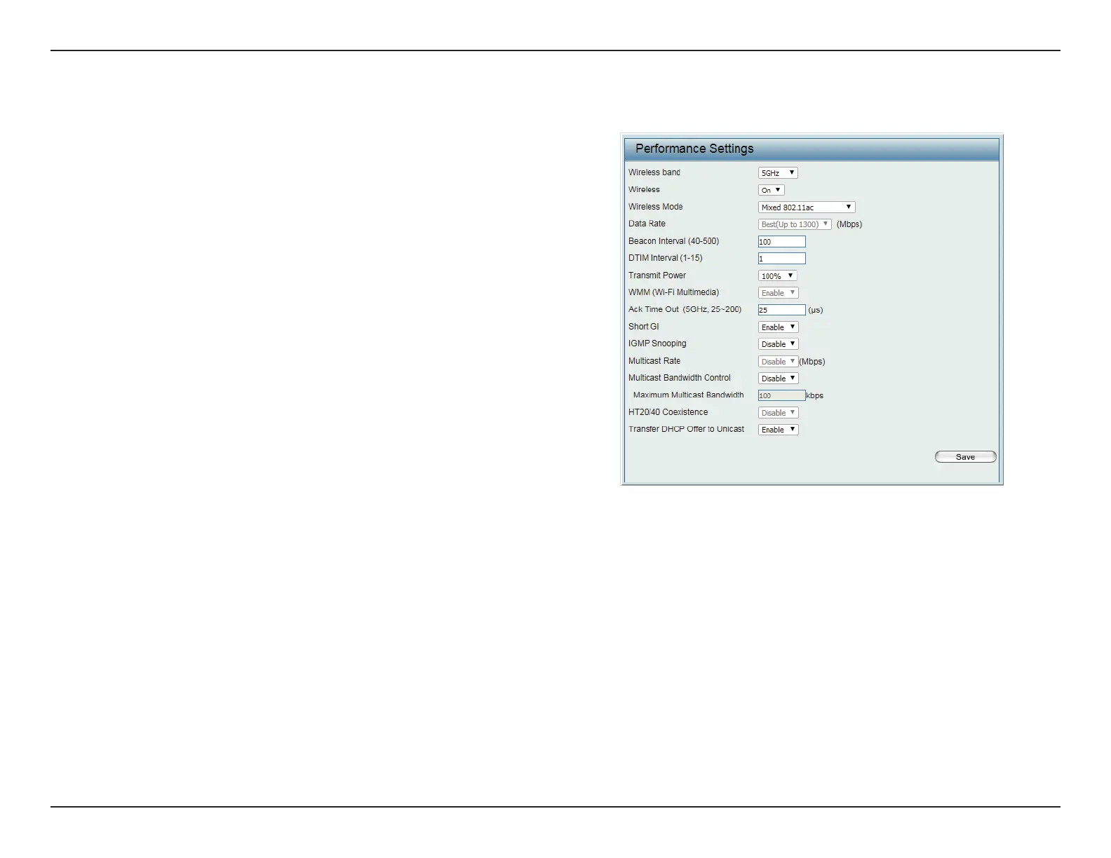 On the Performance Settings page the users can congure more advanced settings concerning the wireless signal and hosting.