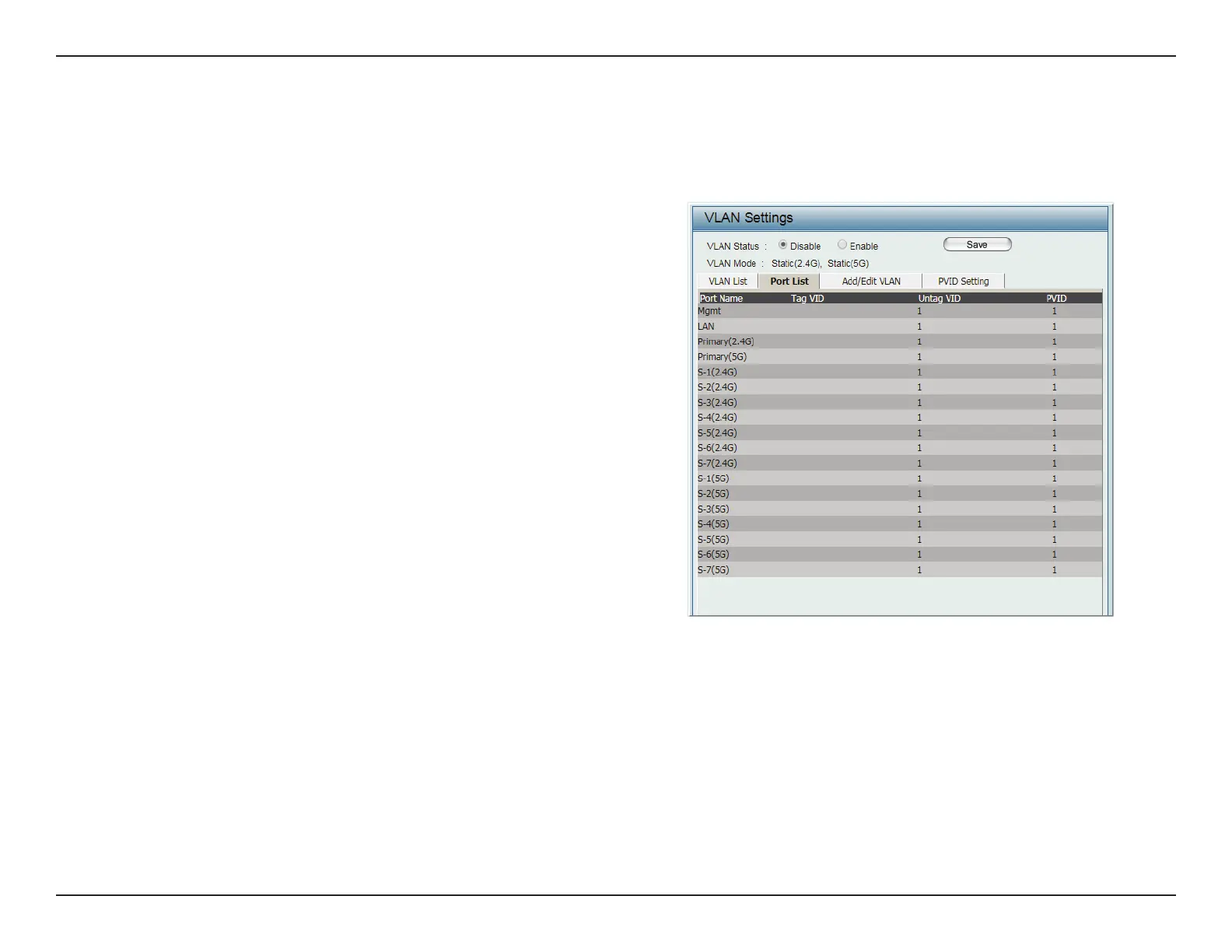 The Port List tab displays the current ports. If you want to congure the guest and internal networks on a Virtual LAN (VLAN), the switch and