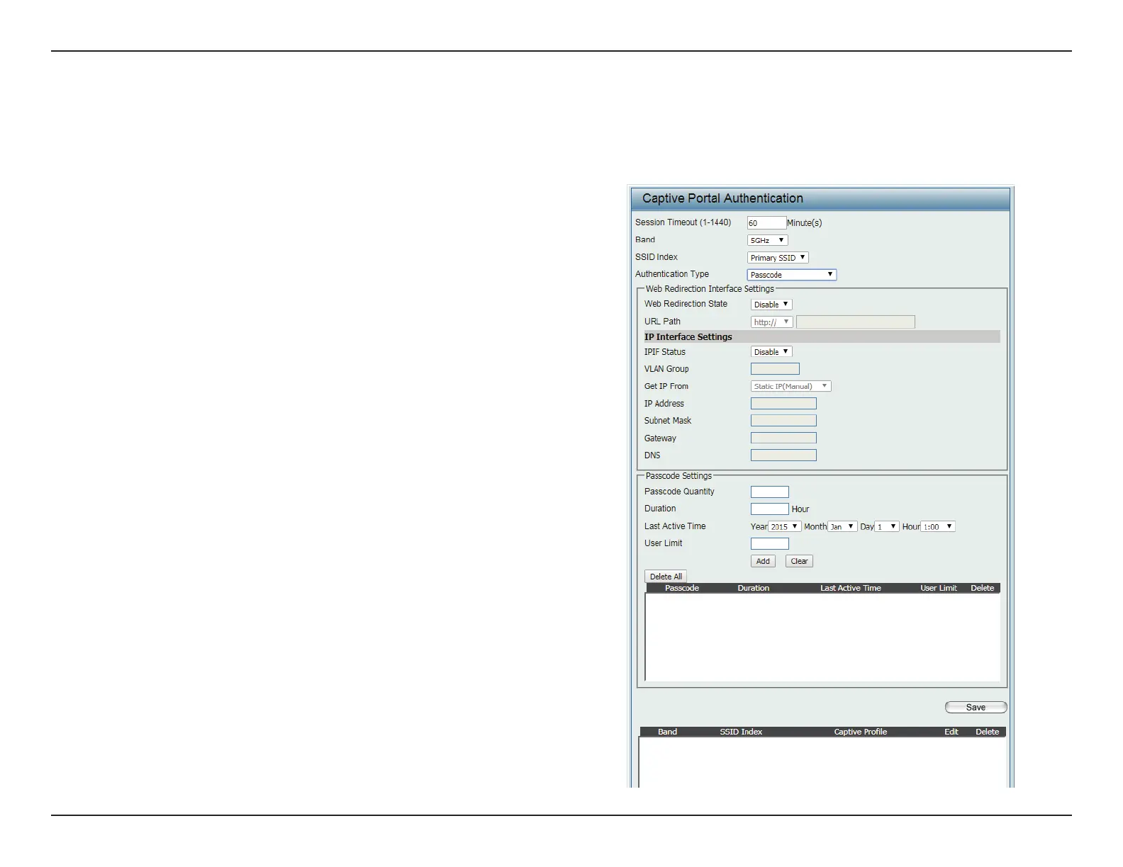 authentication page. In this window, users can view and congure the Captive Portal settings. After selecting Passcode as the Authentication Type,