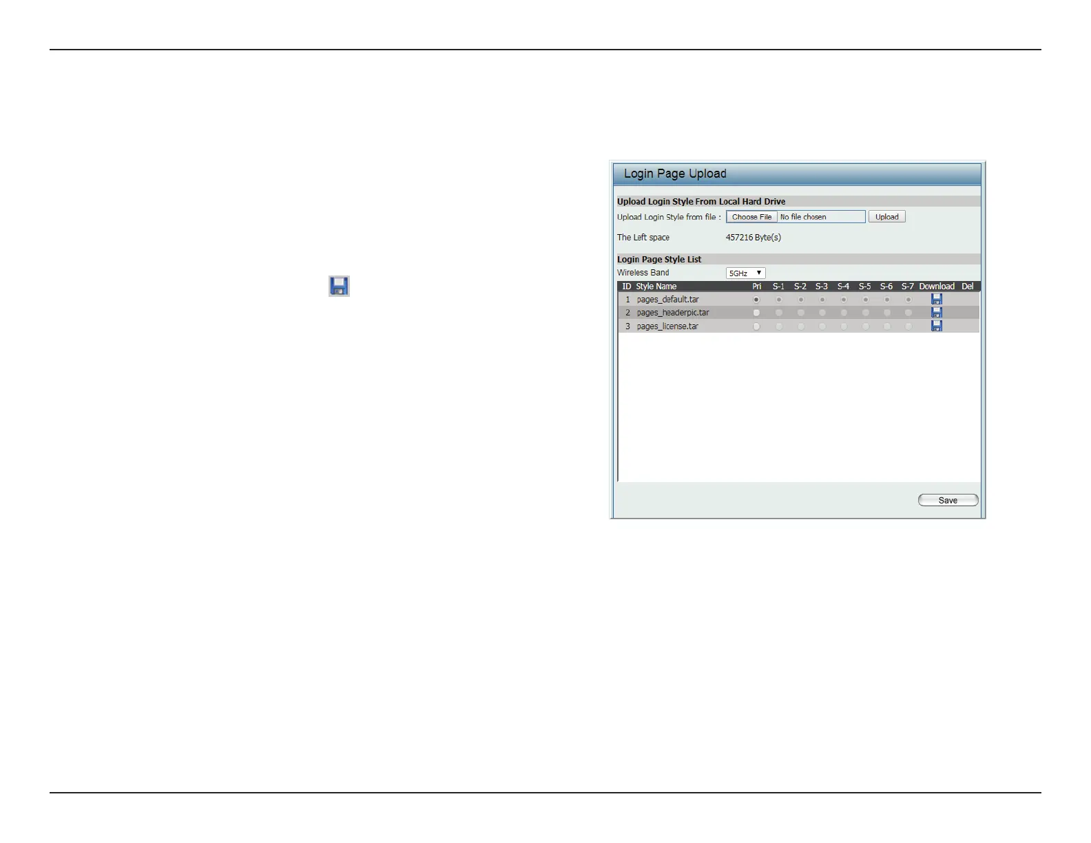 In this window, users can upload a custom login web page that will be used by the captive portal feature. Click Browse to navigate to the login