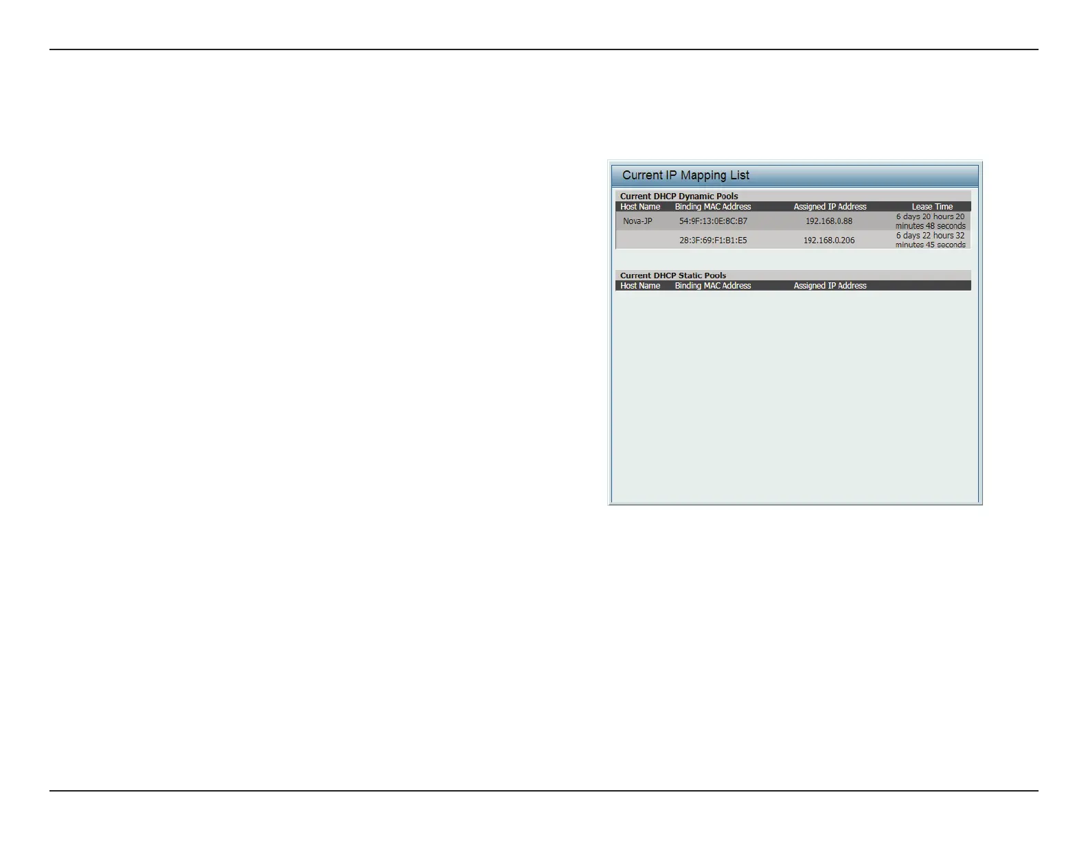 This window displays information about the current assigned DHCP dynamic and static IP address pools. This information is available when you