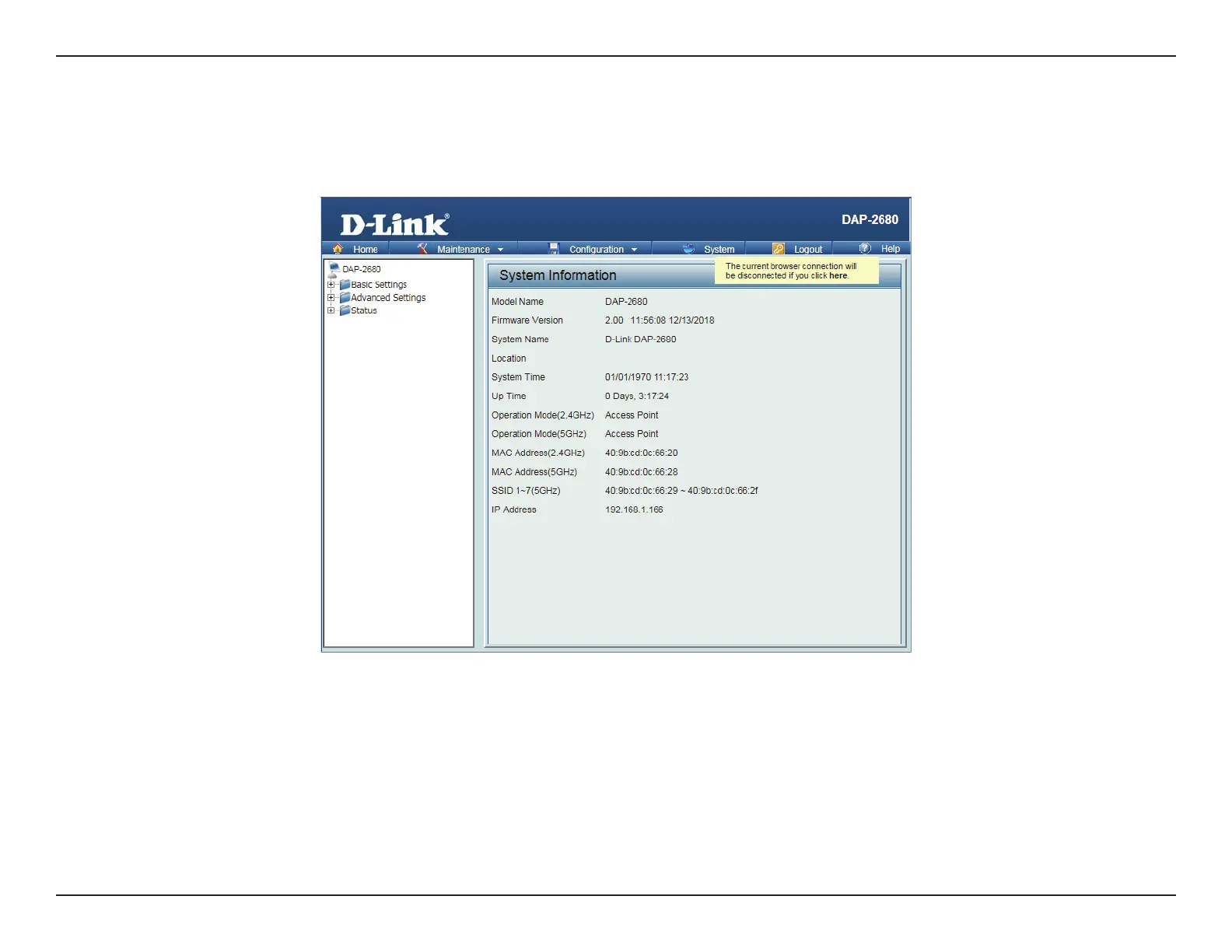 Click Logout to allow the user to safely log out from the access point’s web conguration. Click on The current browser connection will be