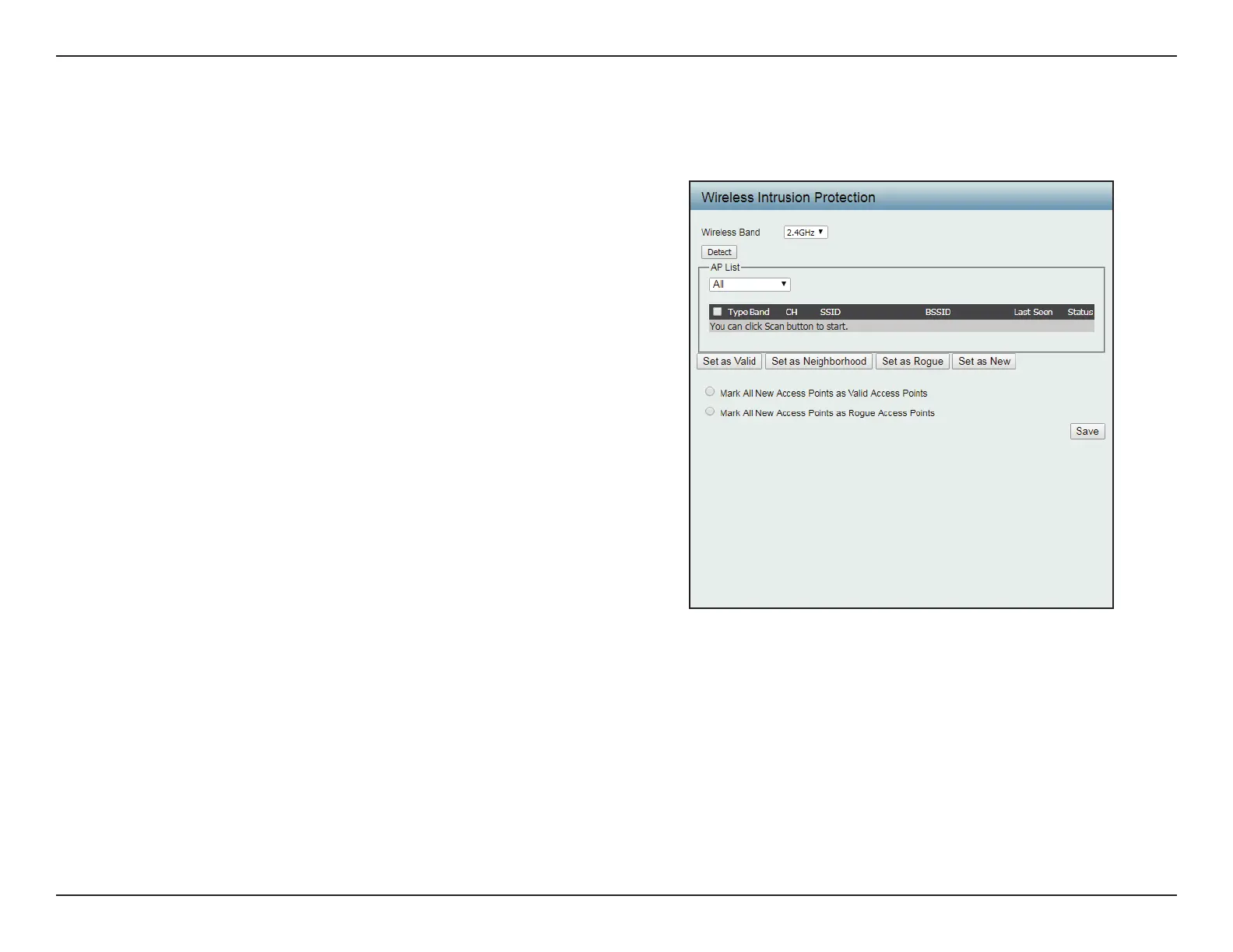 The Wireless Intrusion Protection window is used to classify APs as Valid, Neighborhood, Rogue, or a New group.