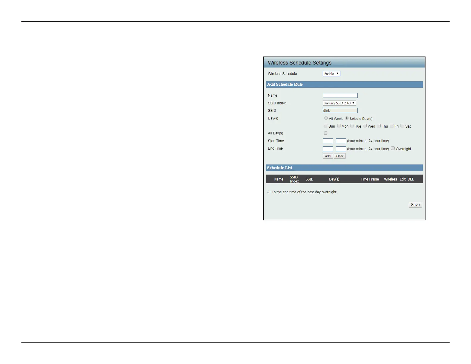 The Wireless Schedule Settings window is used to add and modify schedule rules on the device.