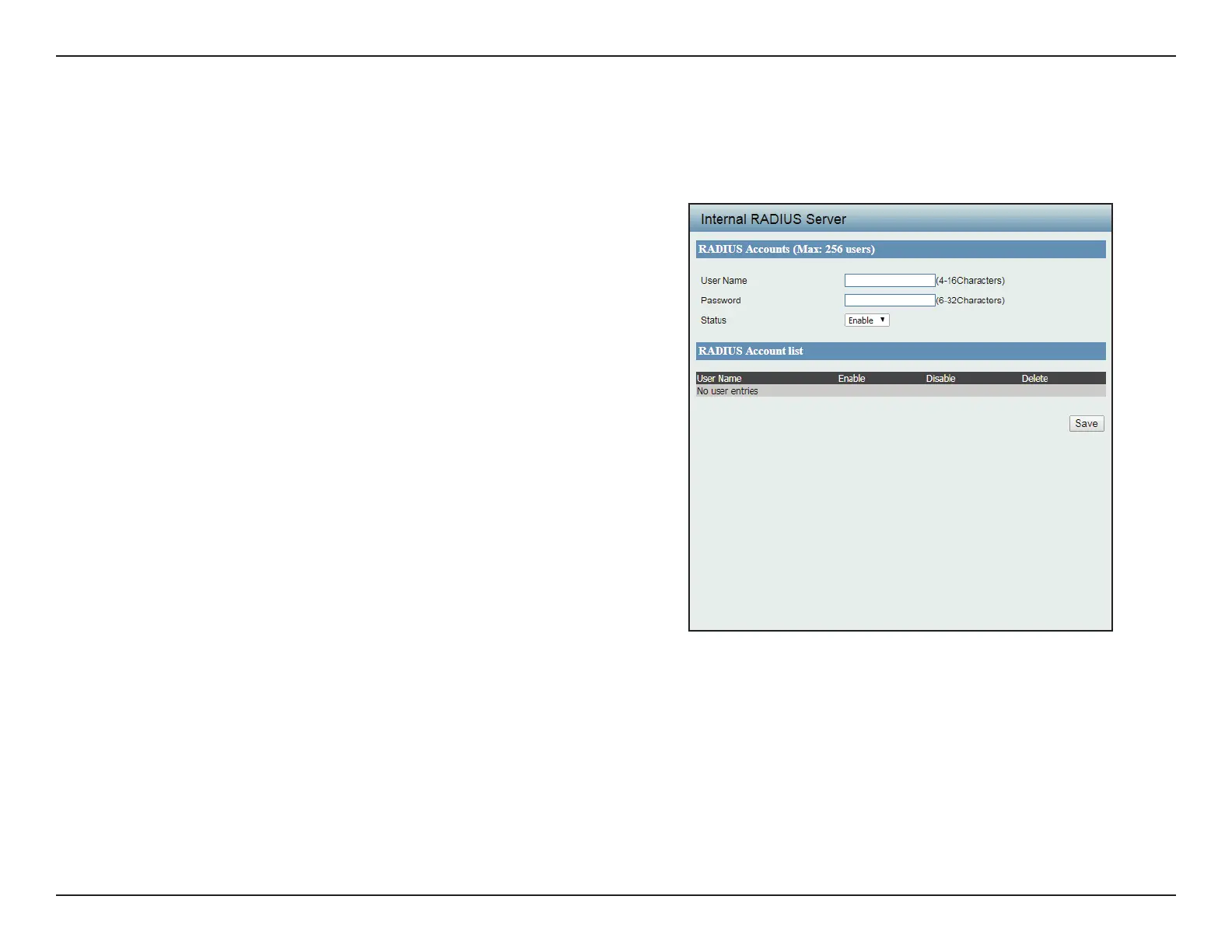 The DAP-3666 features a built-in RADIUS server. Once you have nished adding a RADIUS account, click Save to let your changes take eect. The