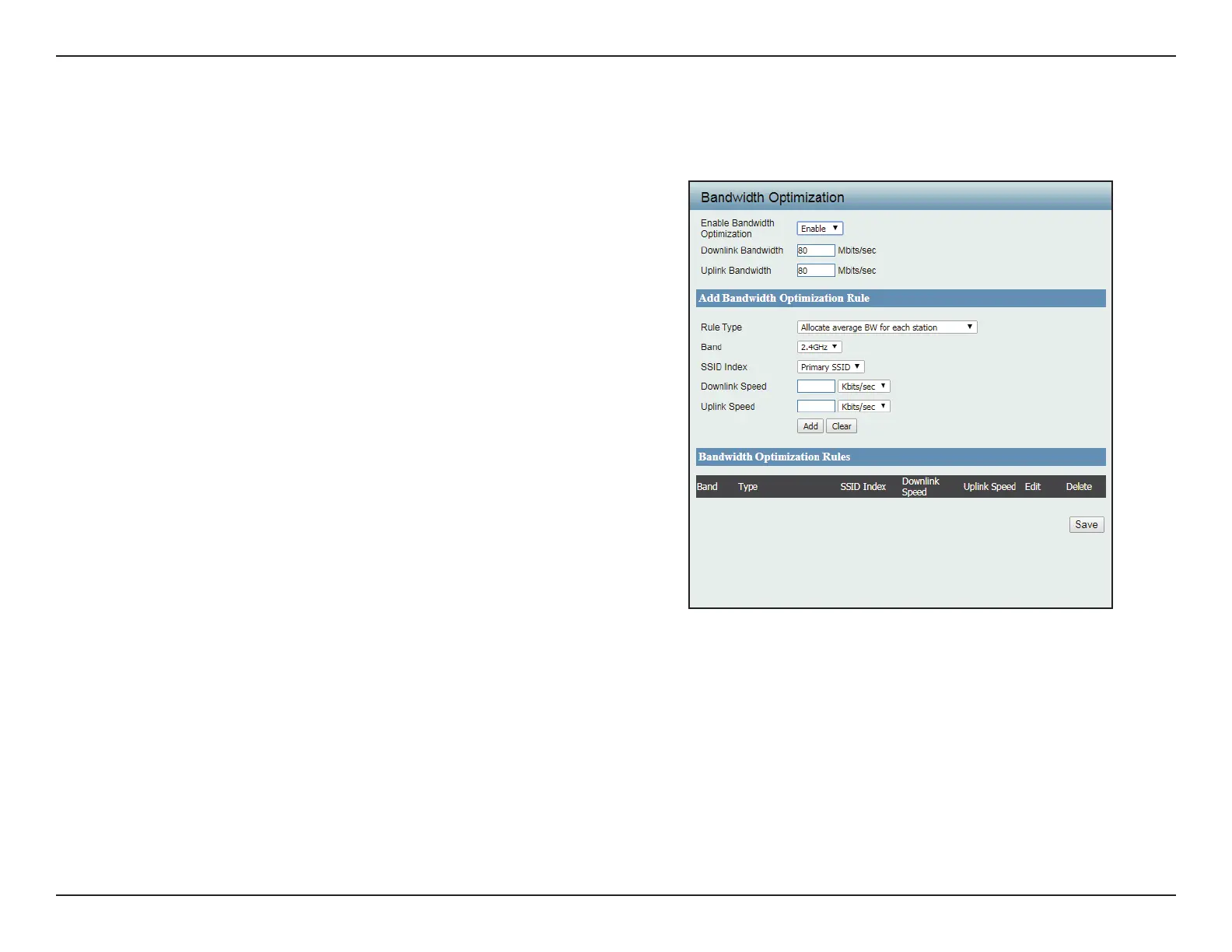 After dening the Bandwidth Optimization rule, click Add. To discard the settings, click Clear. Click Save for the changes to take eect.